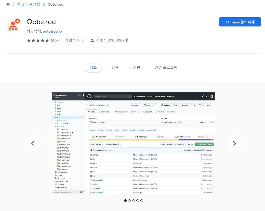 1. 설치 후 레파지토리에 들어가면 왼쪽 중간에 Octotree 탭 위에 마우스를 올려놓으면