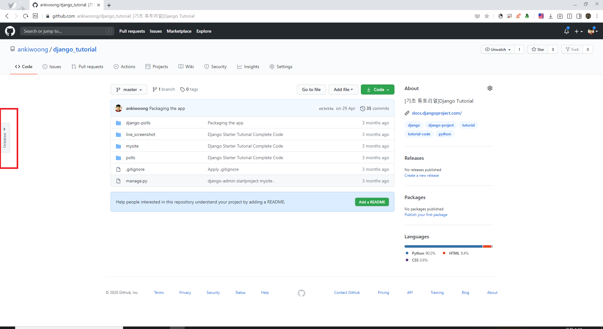 1. 설치 후 레파지토리에 들어가면 왼쪽 중간에 Octotree 탭 위에 마우스를 올려놓으면