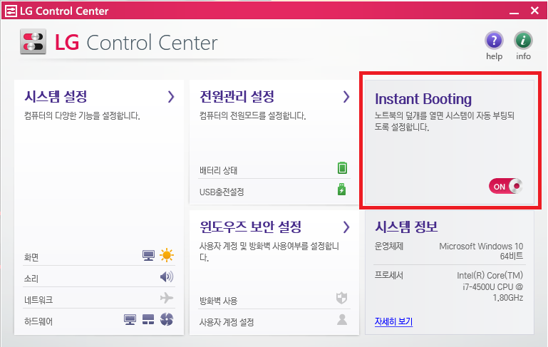 Instant Booting : 노트북 덮개를 열면 시스템이 자동으로 부팅되도록 설정