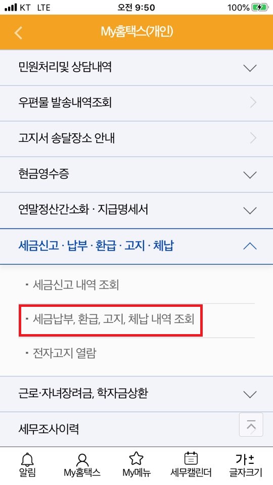 2. 세금신고 / 납부 / 환급 / 고지 / 체납 > 세금납부, 환급, 고지, 체납 내역 조회
