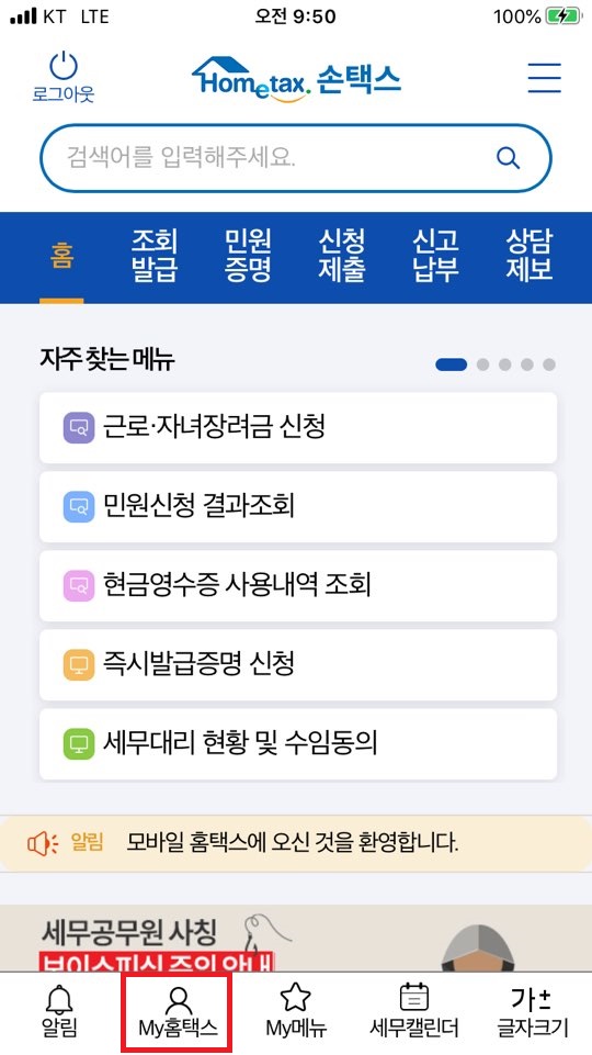 스마트폰에 홈텍스를 설치 후 공인인증서로 로그인 후에