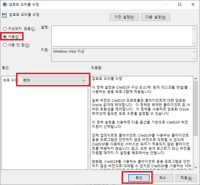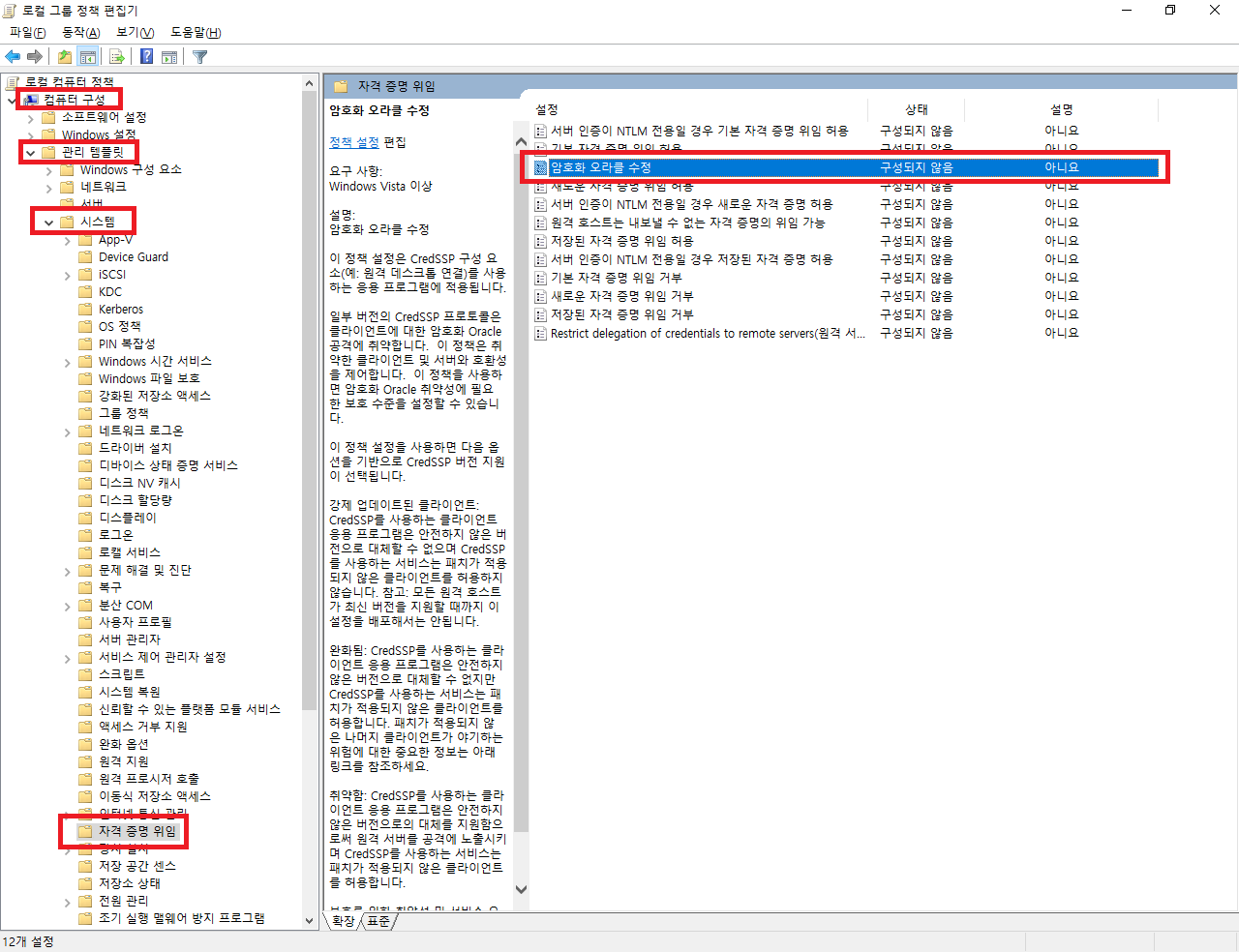컴퓨터 구성 > 관리 템플릿 > 시스템 > 암호화 오라클 수정