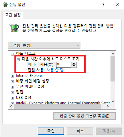 6. 하드디스크 > 다음 시간 이후에 하드 디스크 끄기 > 0(사용 안함)