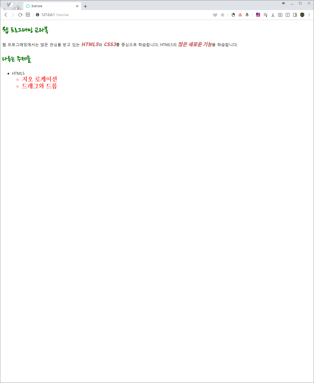 <strong>CSS3</strong>를 중심으로 학습합니다. HTML5의 <em>많은 새로운 기능</em>을 학습합니다.