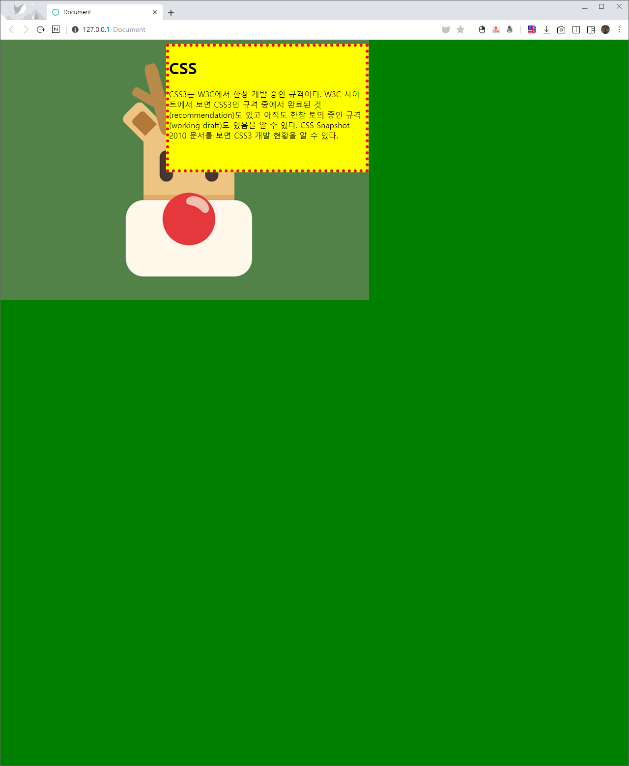 <body> 요소의 배경색은 녹색이고 image.png라는 이미지를 한 번만 왼쪽 상단에 표시한다.