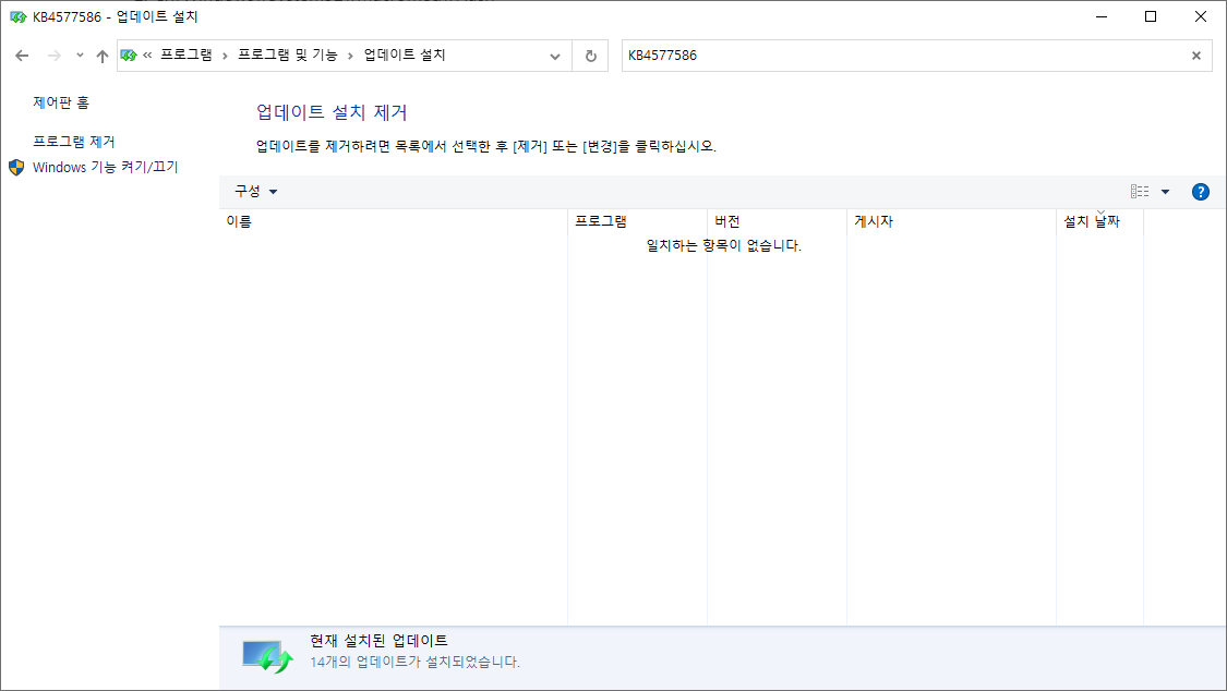 제거 업데이트 패치 번호를 확인하여 제거 한다.