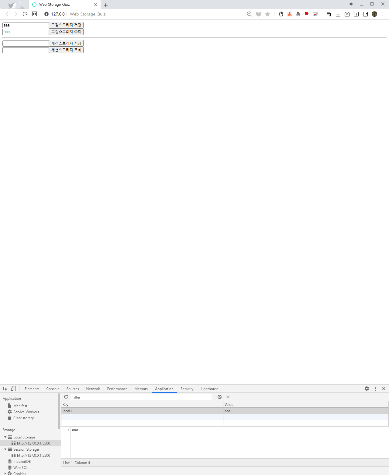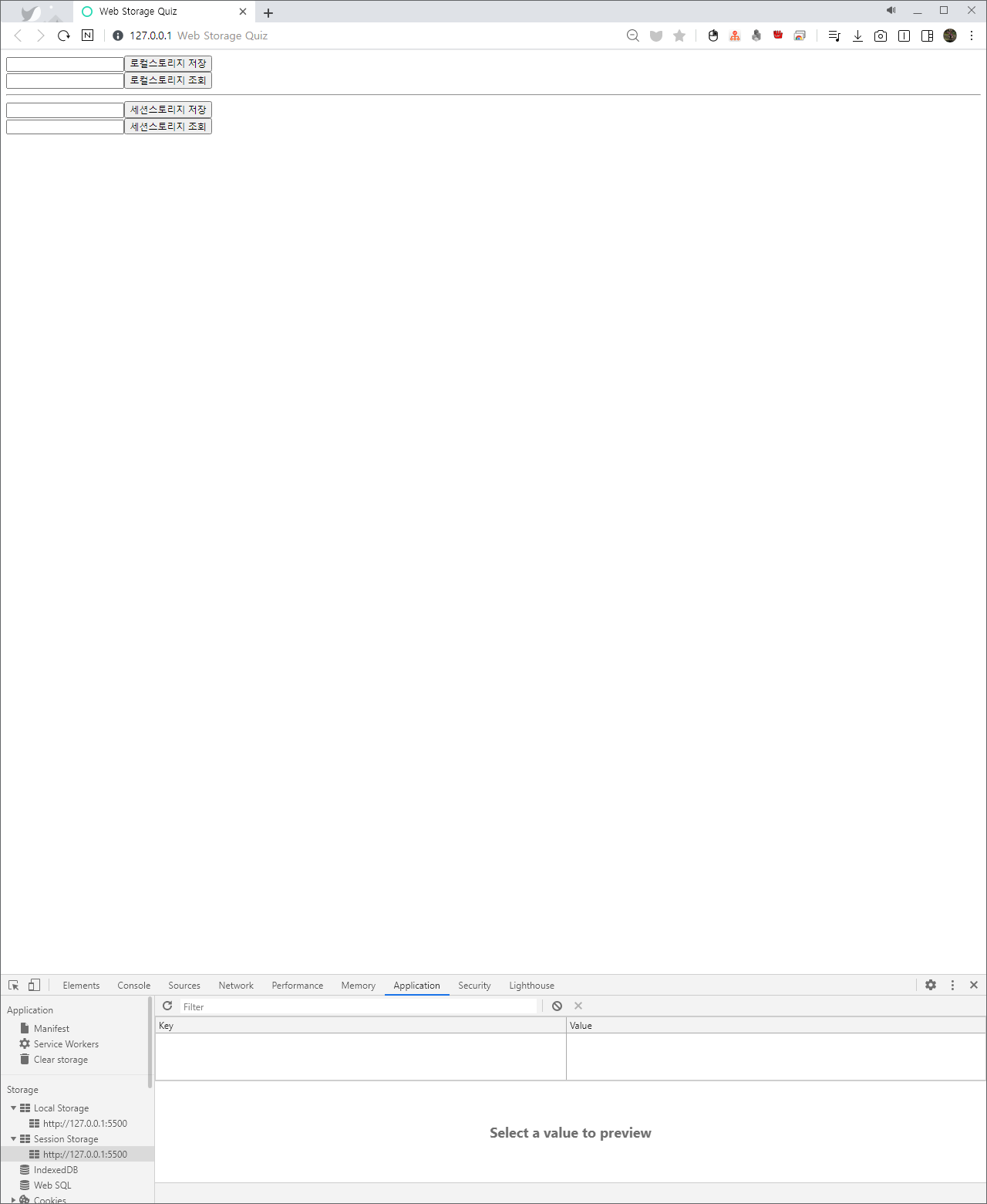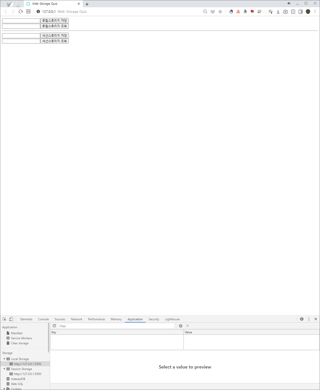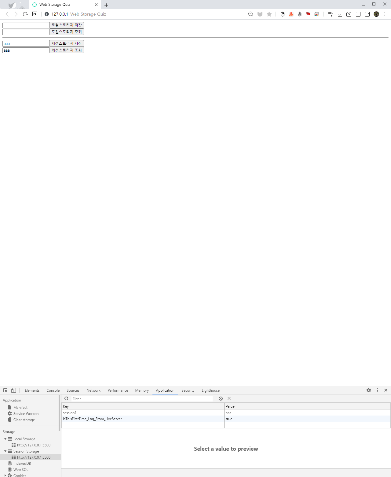 웹 스토리지를 이용해 사용자가 입력한 문자열을 로컬 스토리지와 세션 스토리지에 저장했다가 "조회" 버튼을