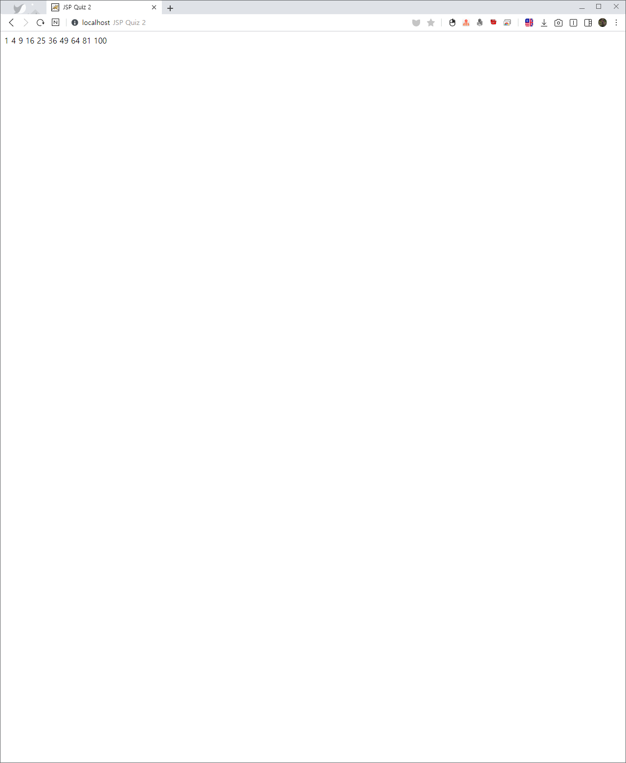 <% for (int i=1; i<=10; i++) { out.print(i*i + " " ); } %>