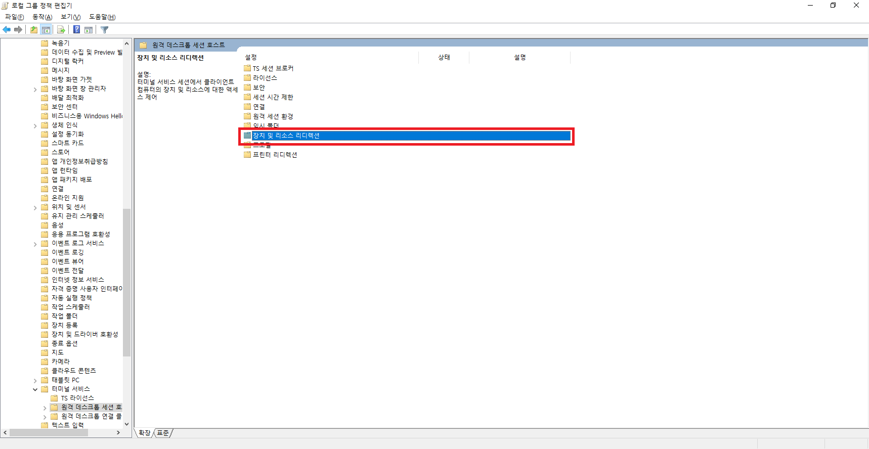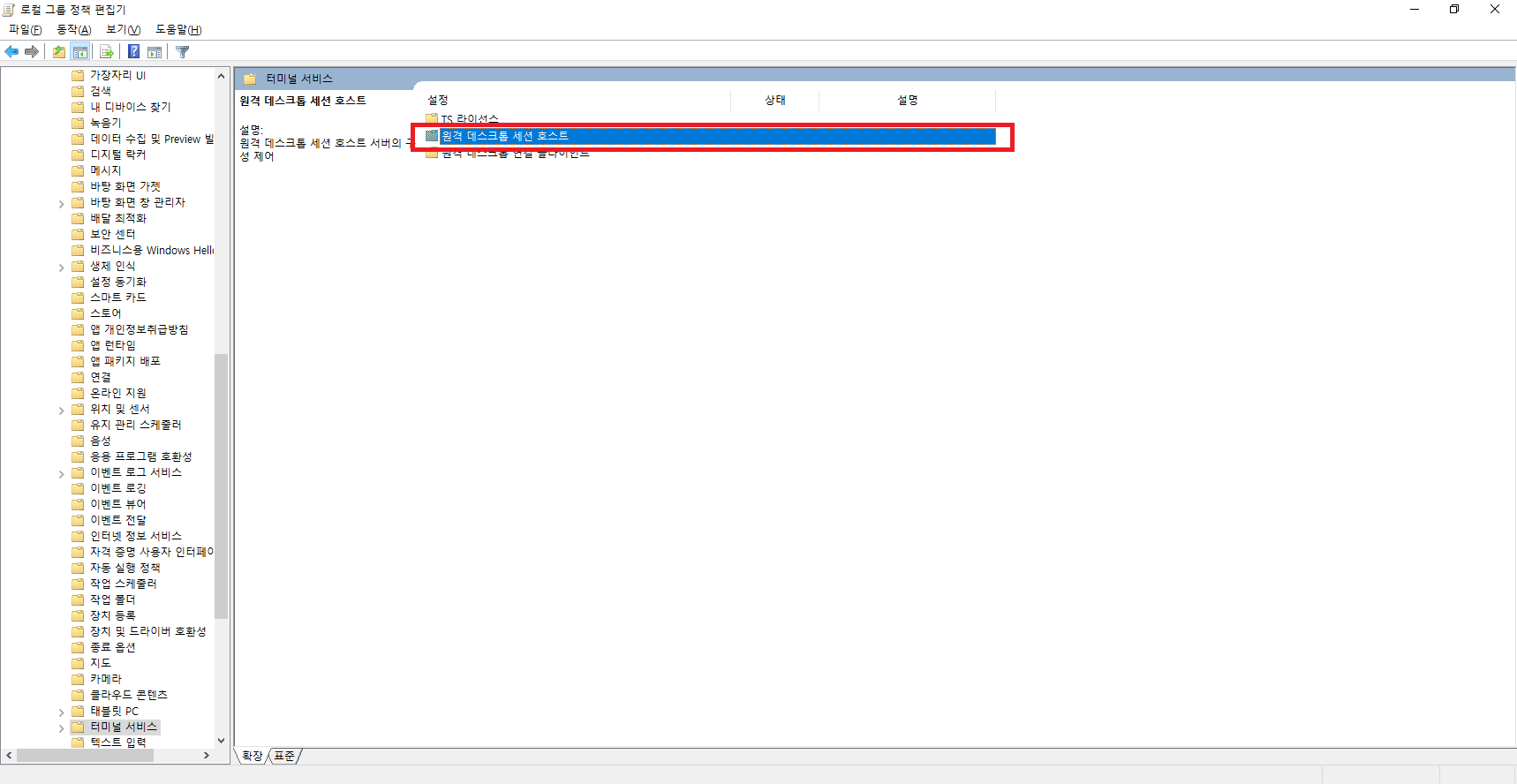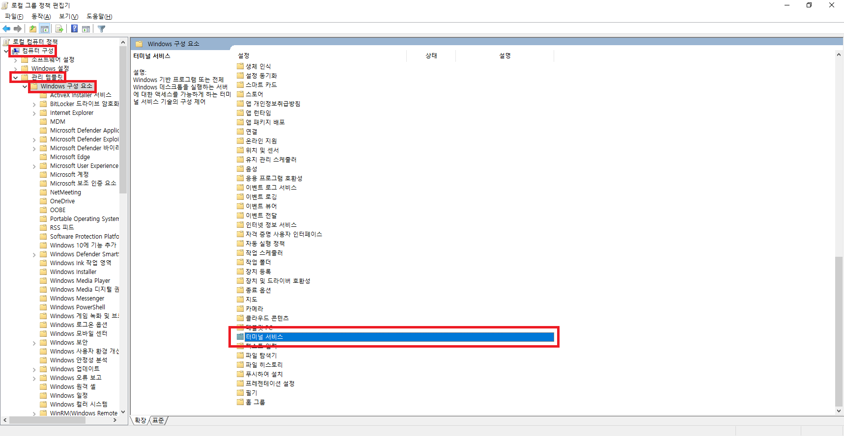 2. 컴퓨터 구성 -> 관리 템플릿 -> Windows 구성 요소 -> 터미널 서비스
