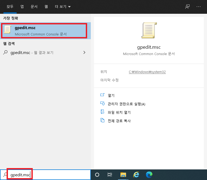 1. 시작 -> gpedit.msc(로컬 그룹 정책 편집기)