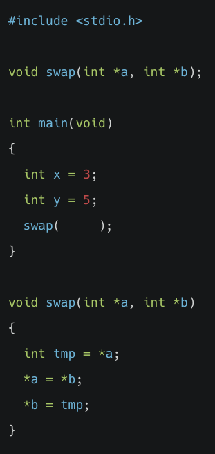 즉, swap 함수가 호출된 이후 x는 5, y는 3의 값을 가져야 합니다.