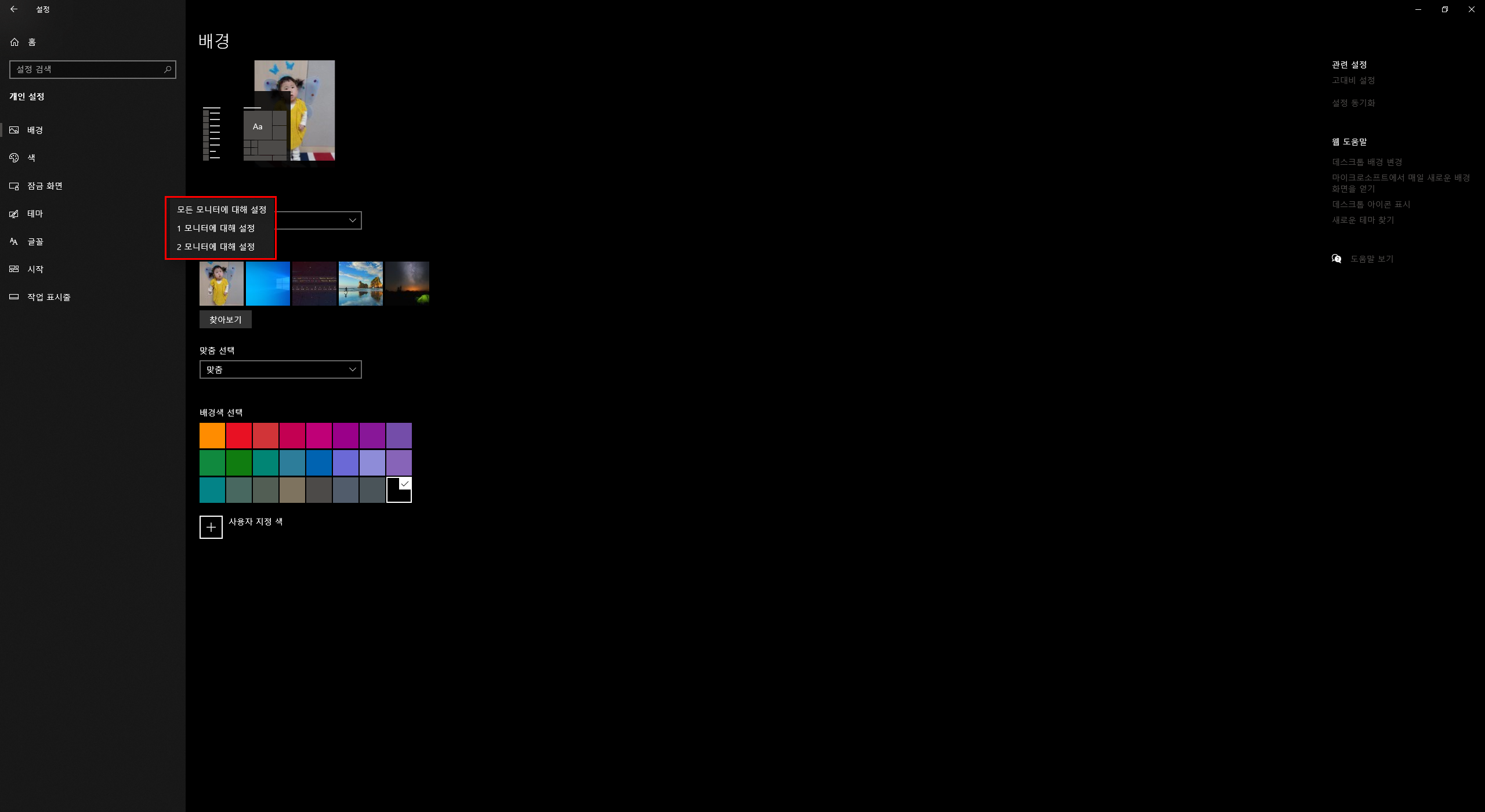 - 2 모니터에 대해 설정 : 2번 모니터의 배경화면에만 적용