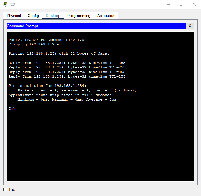 Reply from 192.168.1.254: bytes=32 time<1ms TTL=255