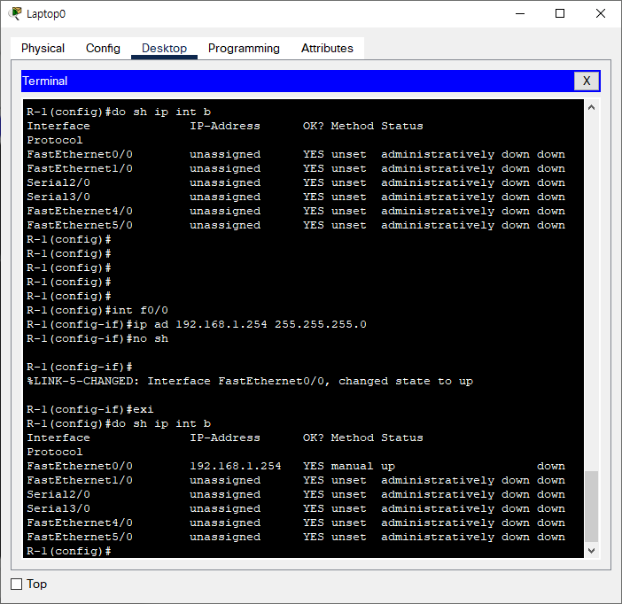 FastEthernet0/0 192.168.1.254 YES manual up down