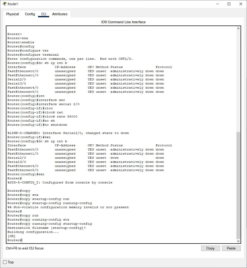 Router의 Serial 2/0의 클럭 속도를 56K로 설정하고, NVRAM에 저장하시오.