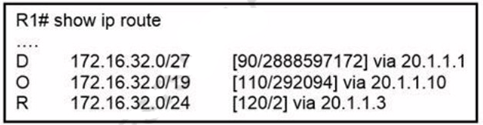 Router R1 is running three different routing protocols. Which route characteristic is used by the router to forward the packet that it receives for destination IP 172.16.32.1?