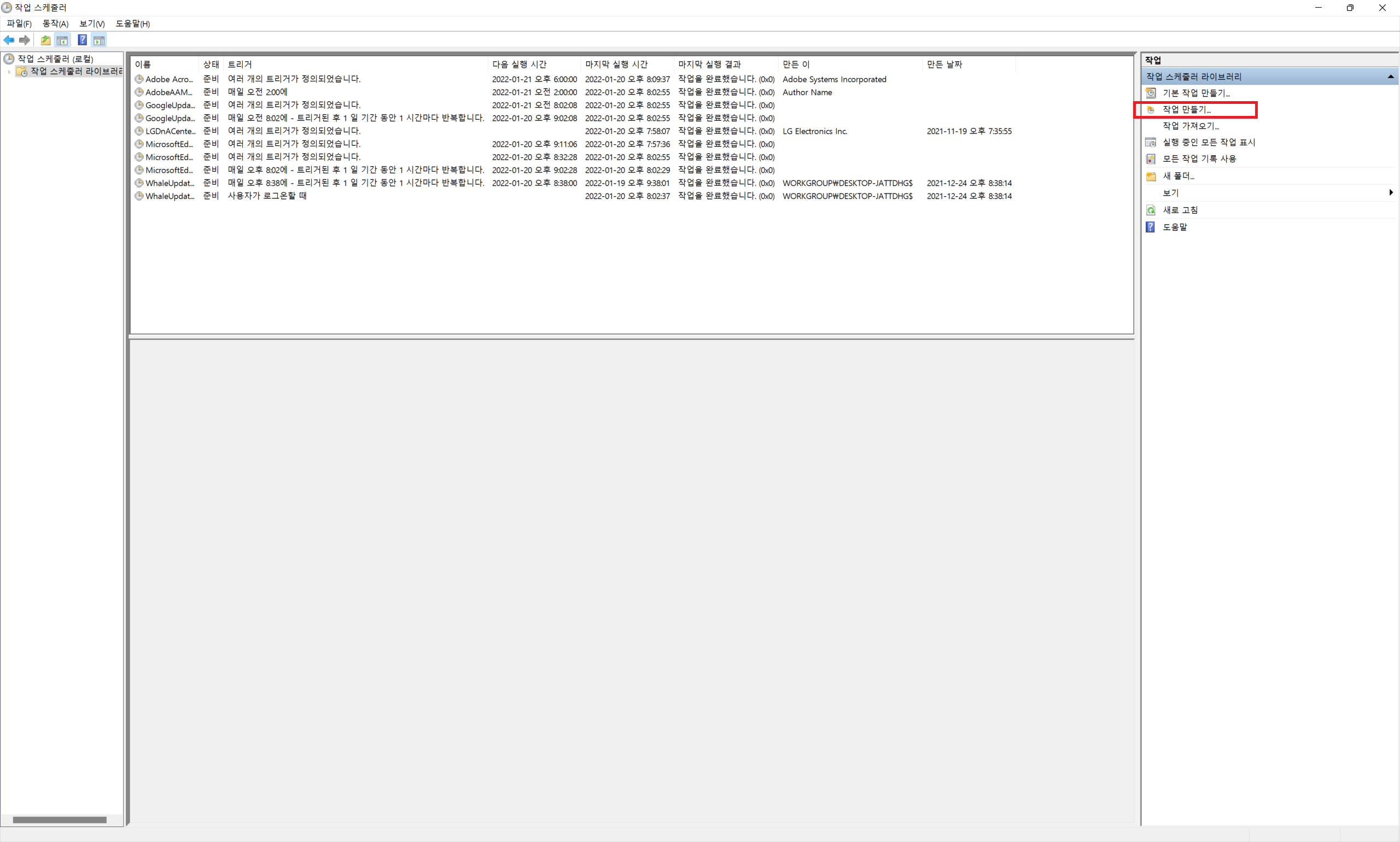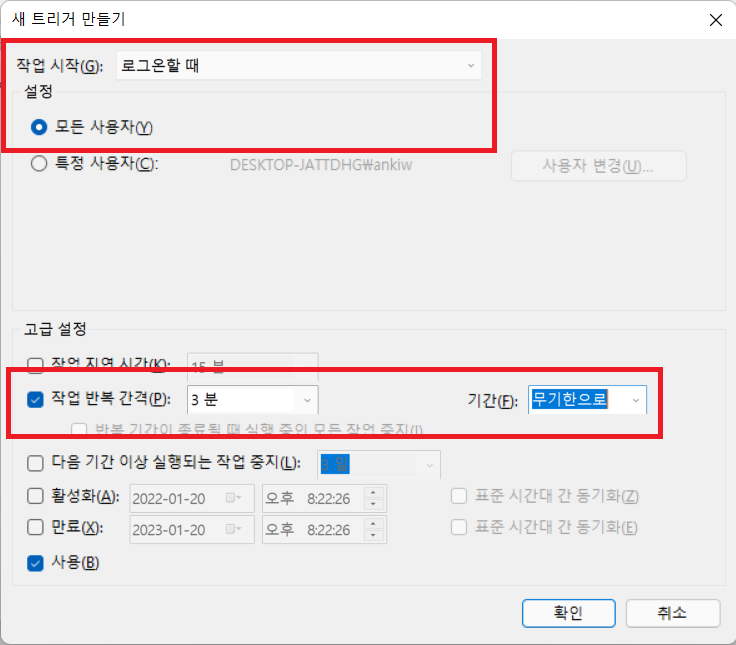 5. 작업 시작 -> 로그온할 때 / 모든 사용자