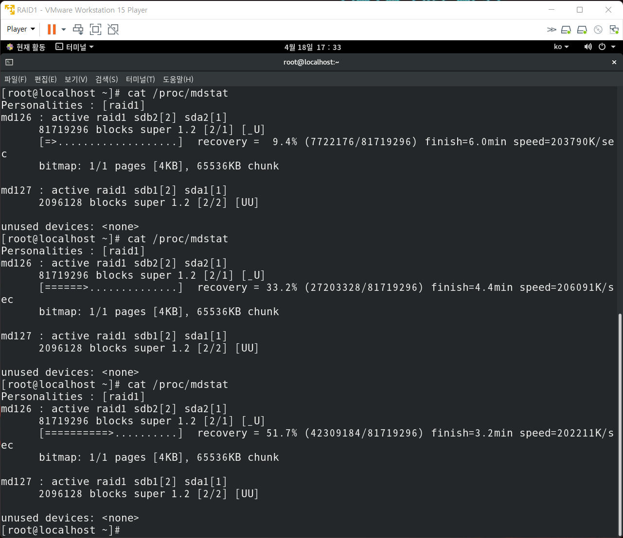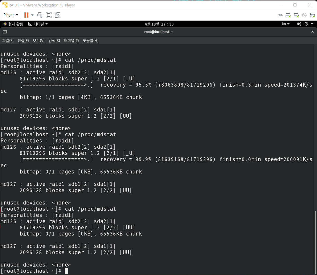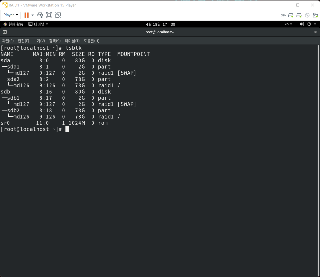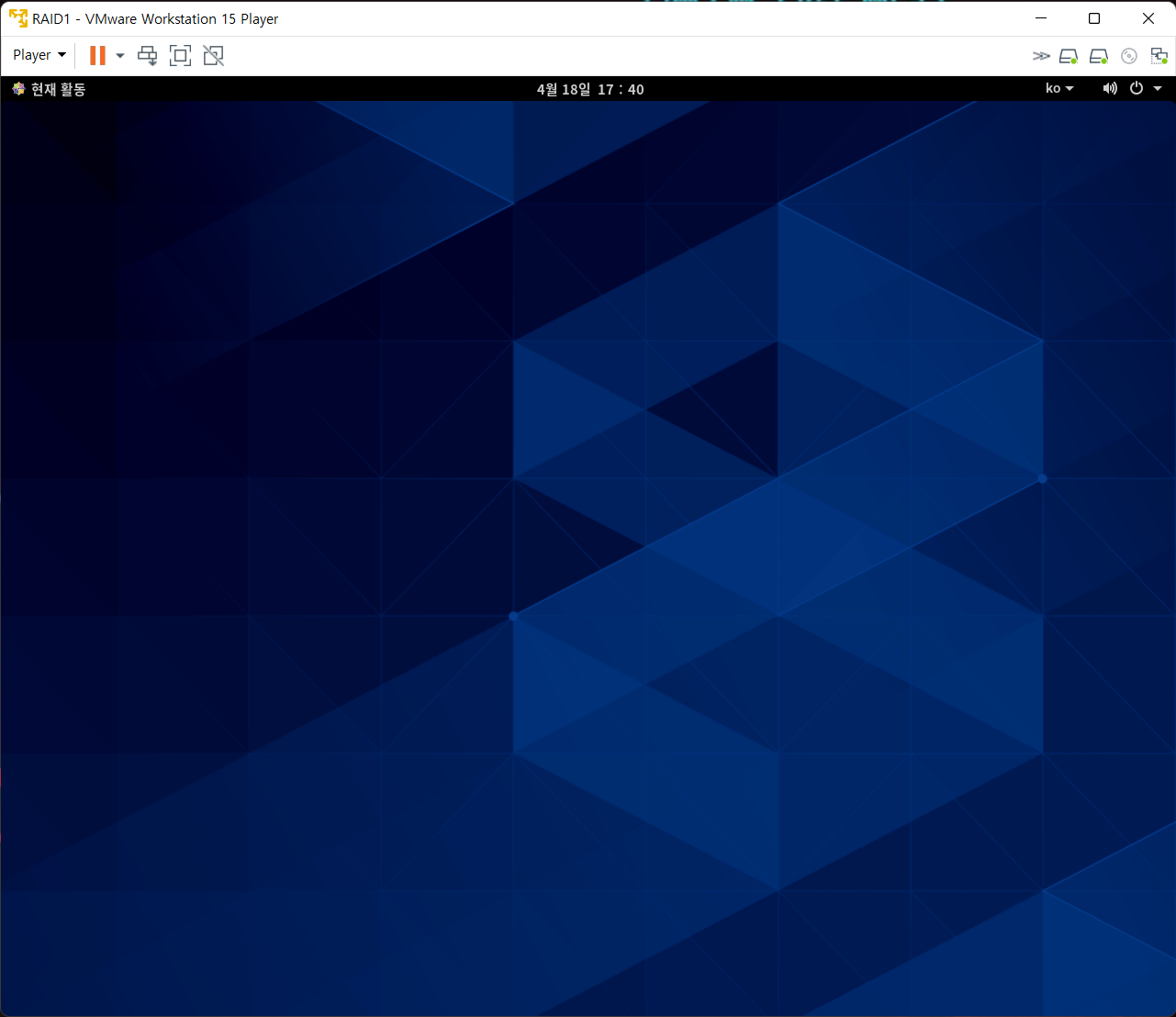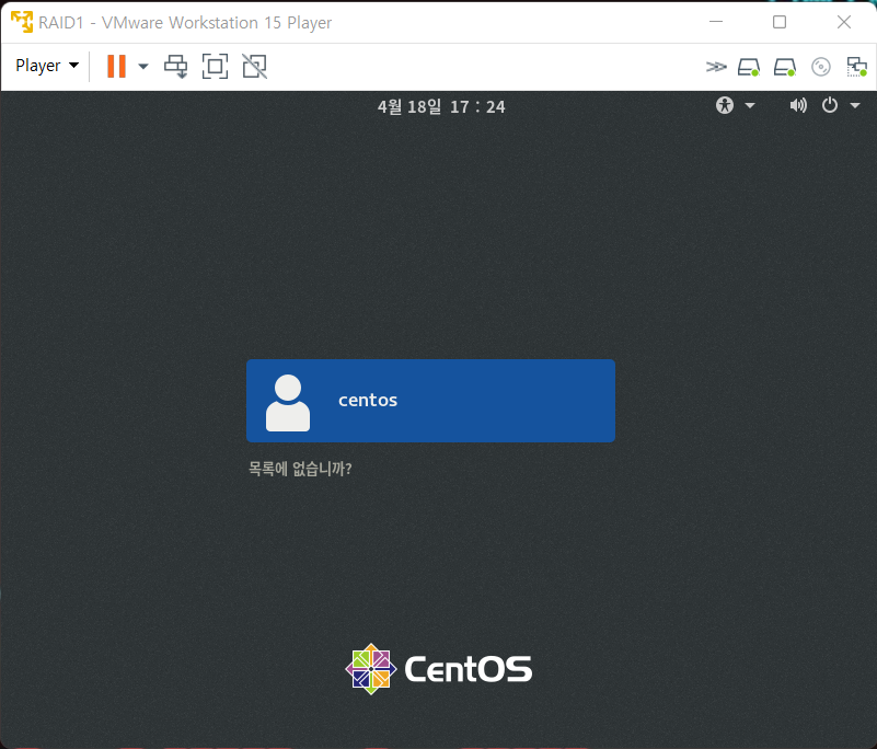 4. 부팅(RAID 1 은 결함 허용이라 부팅은 정상적으로 가능하다.)