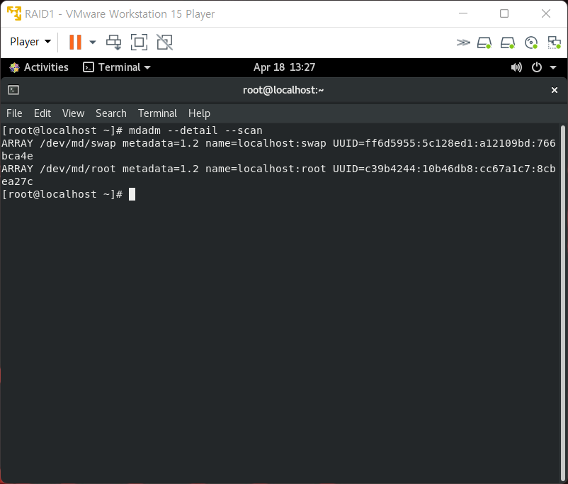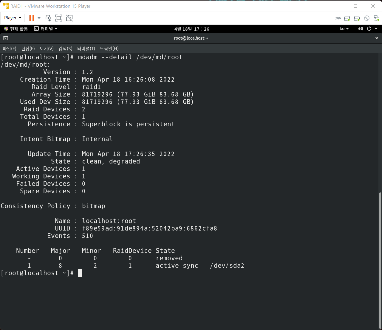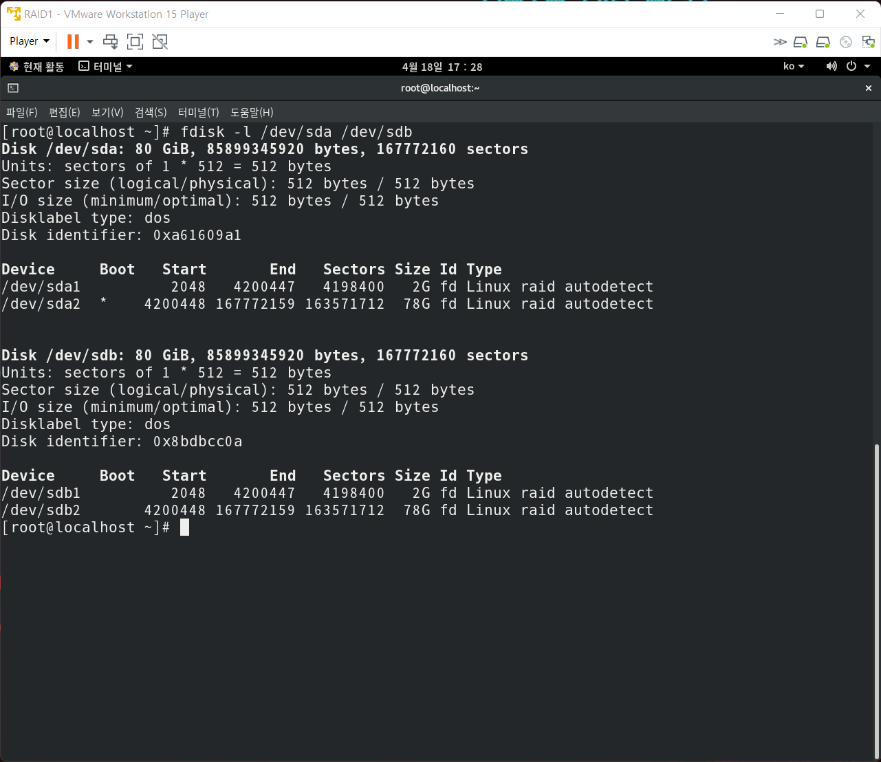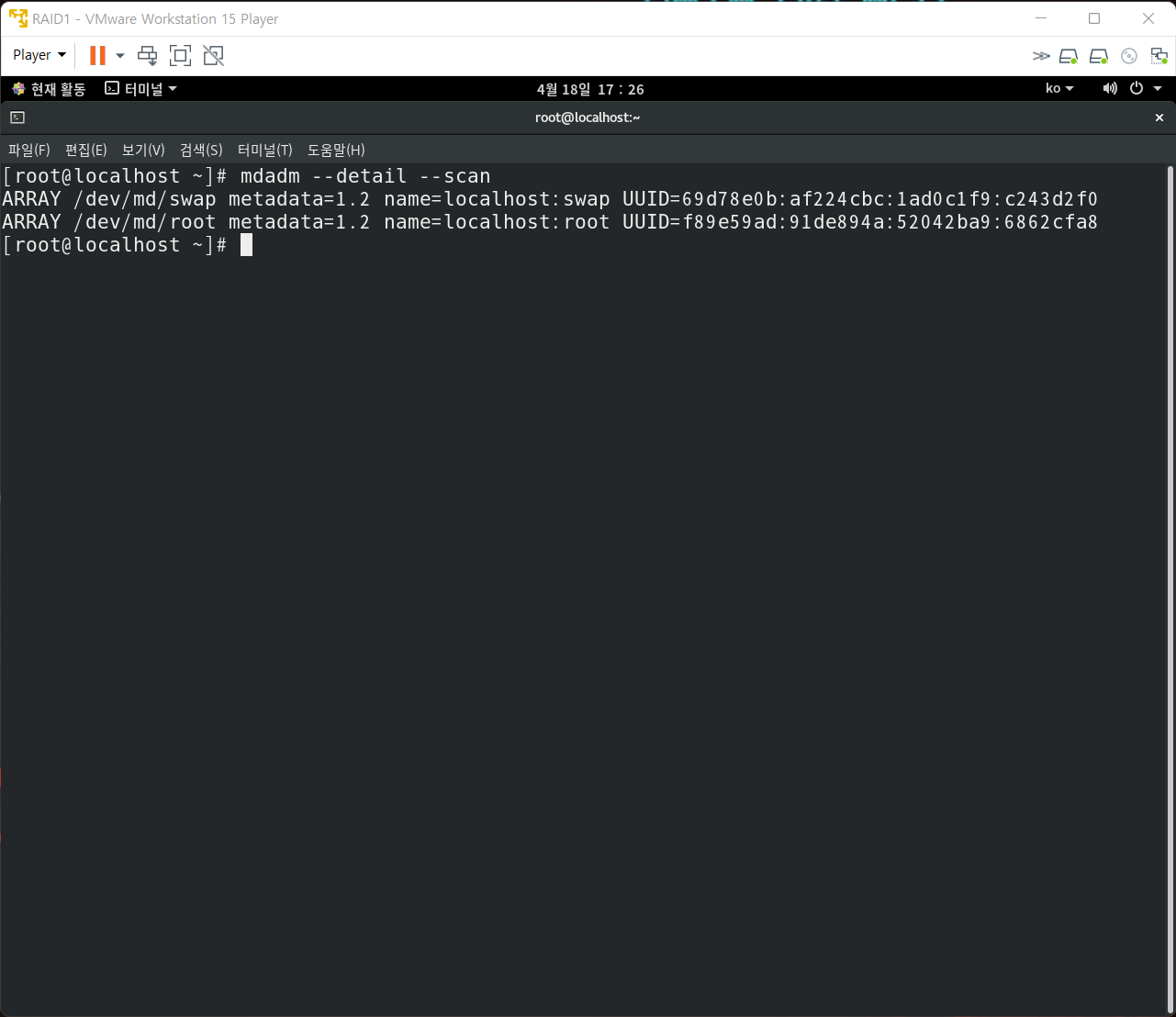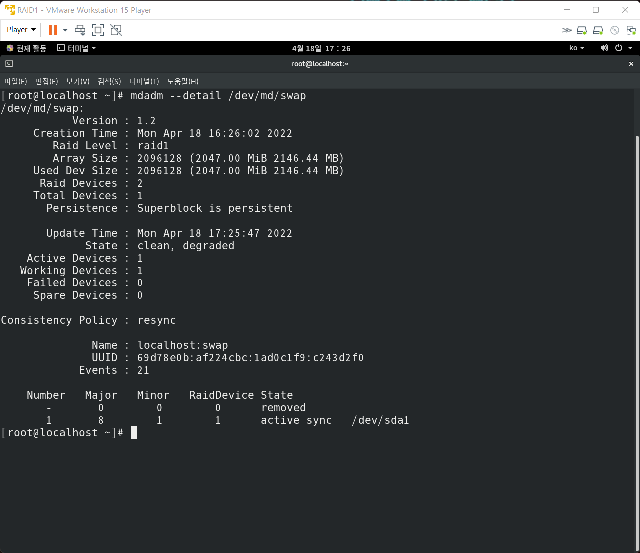 4. 부팅(RAID 1 은 결함 허용이라 부팅은 정상적으로 가능하다.)