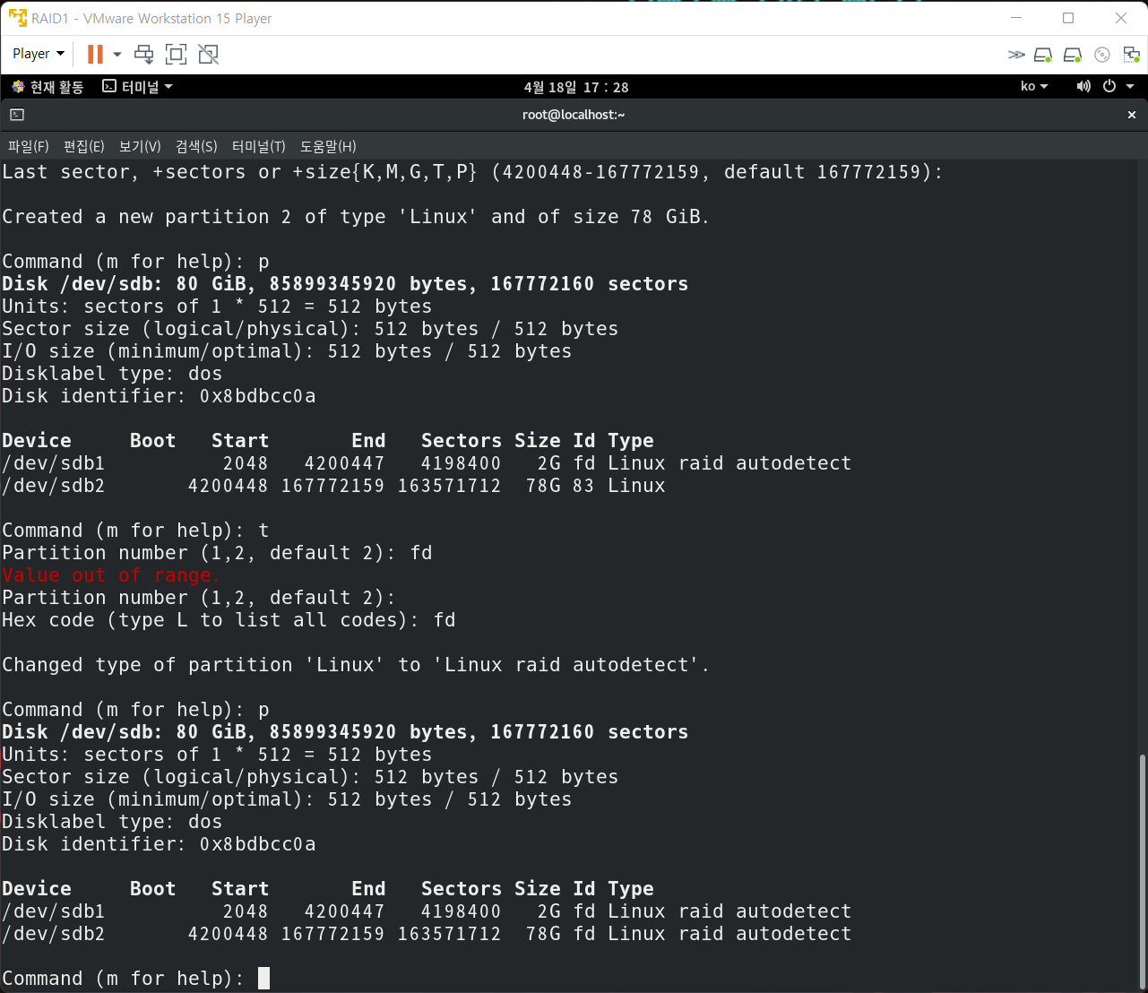 6. fdisk 작업(기존 파티션과 동일 하게 구성 후 동일하게 추가)