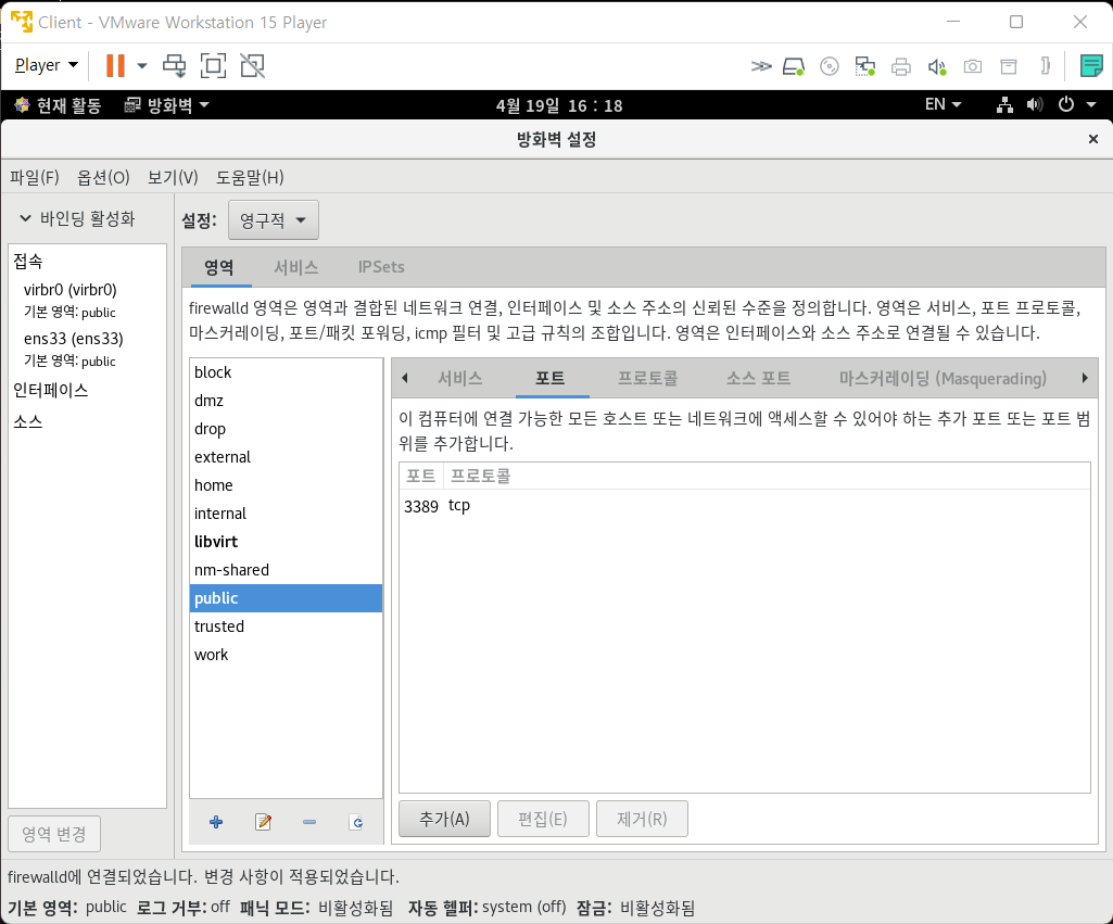 6. xrdp port 활성화 설정(sudo firewall-config 가 아닌 firewall-config 입력 후 root password를 입력한다)