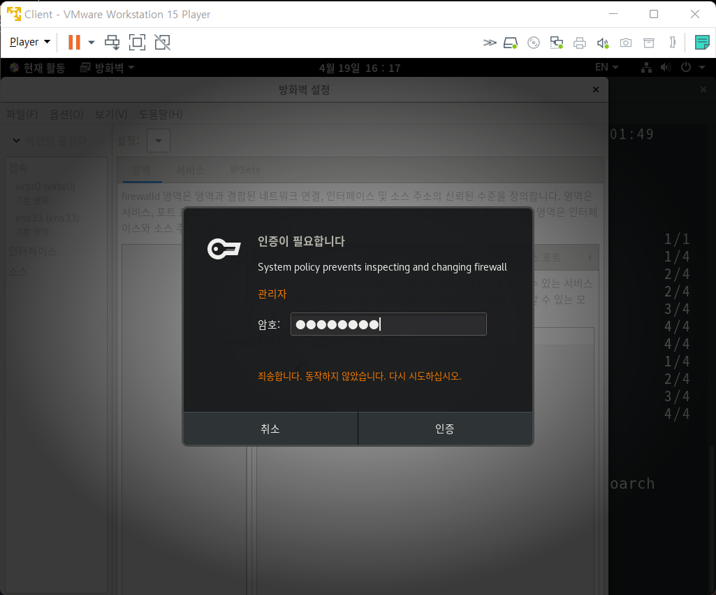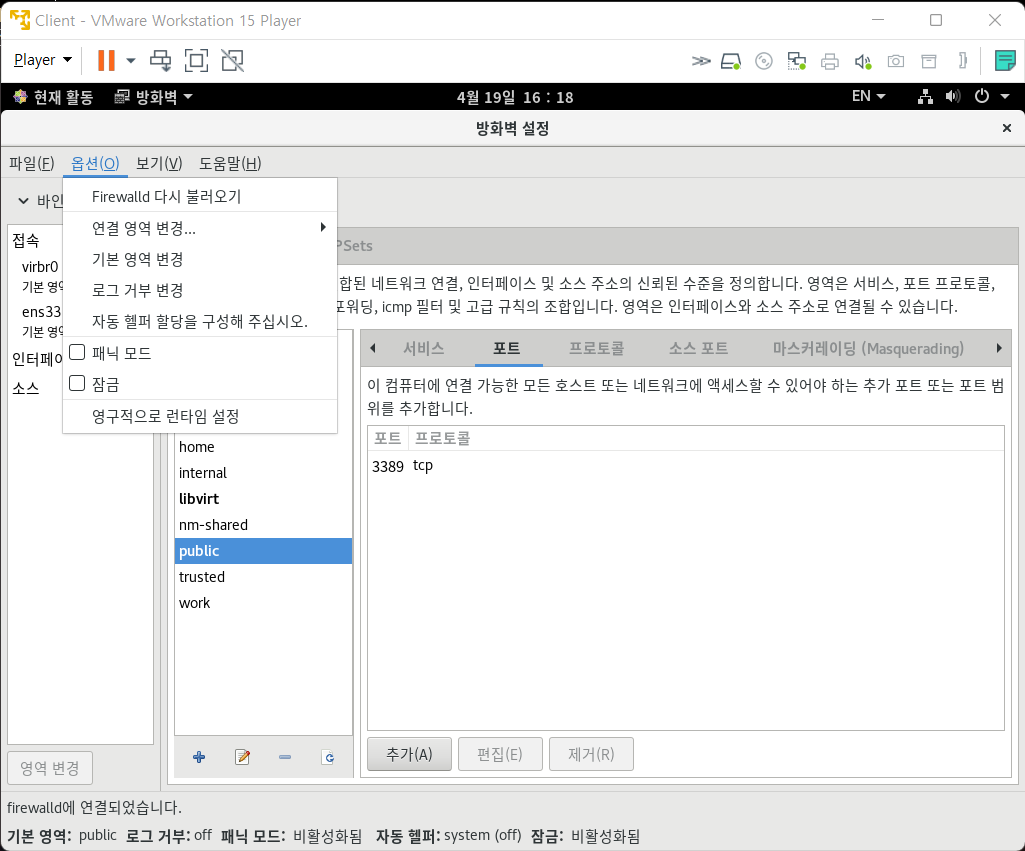 6. xrdp port 활성화 설정(sudo firewall-config 가 아닌 firewall-config 입력 후 root password를 입력한다)
