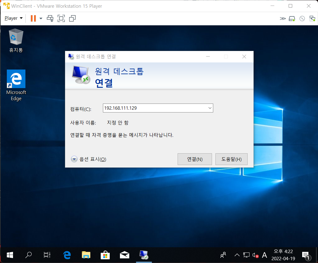 7. WinClient 또는 Host에서 원격 데스크톱 프로토콜(Remote Desktop Protocol)으로 접속 확인