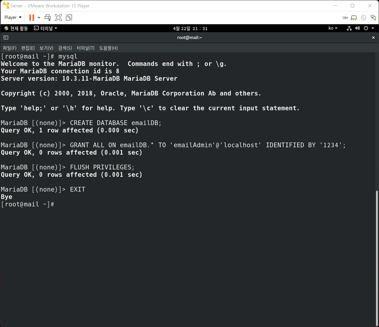 5. 데이터 베이스 설정(emailAdmin@localhost / 1234)
