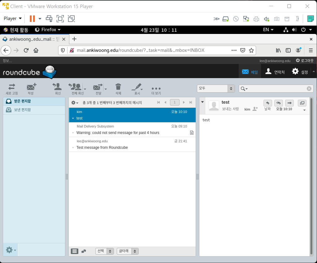 3. 메일 수신(발신 : kim@ankiwoong.or.kr/ 수신 : kim@ankiwoong.edu)