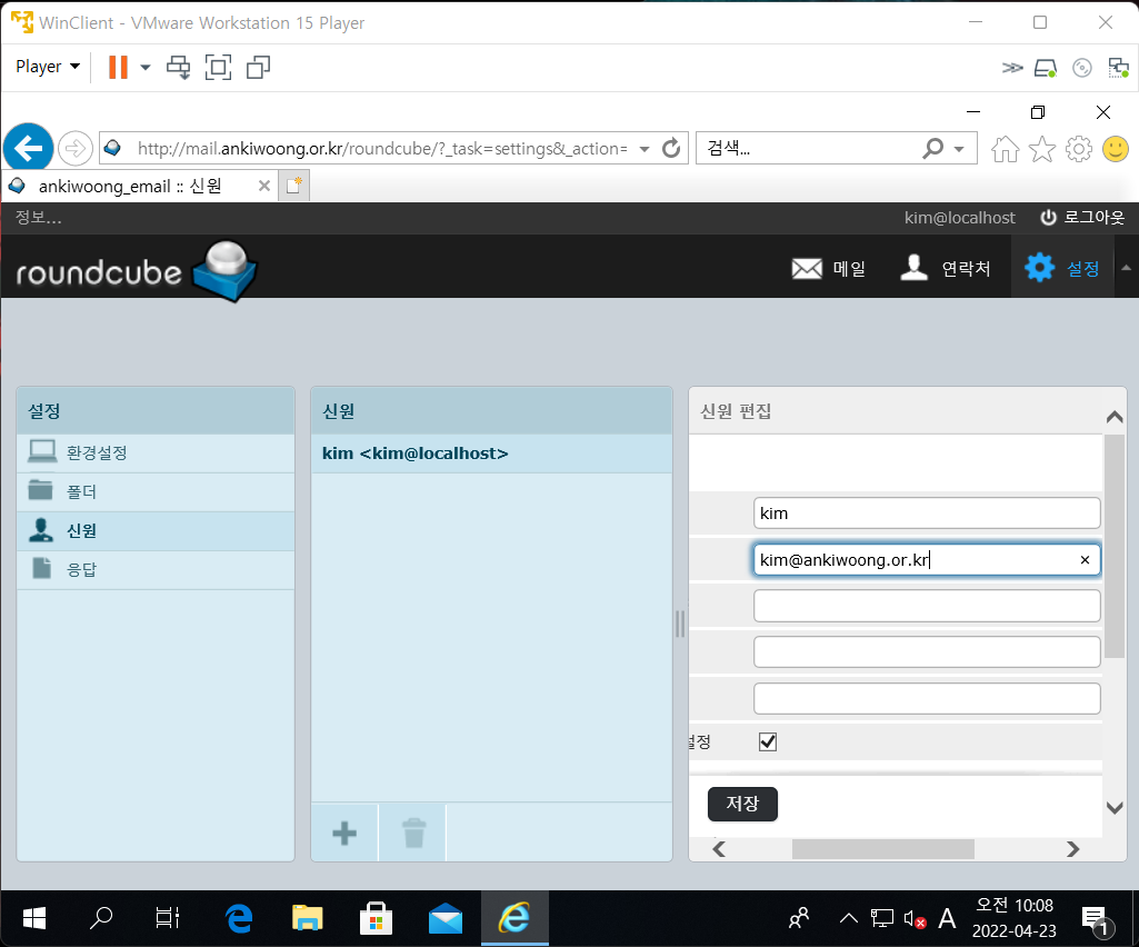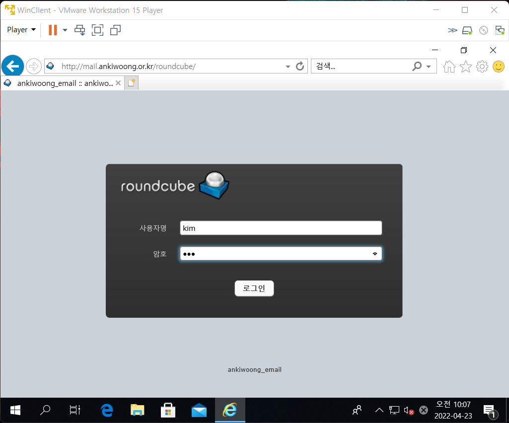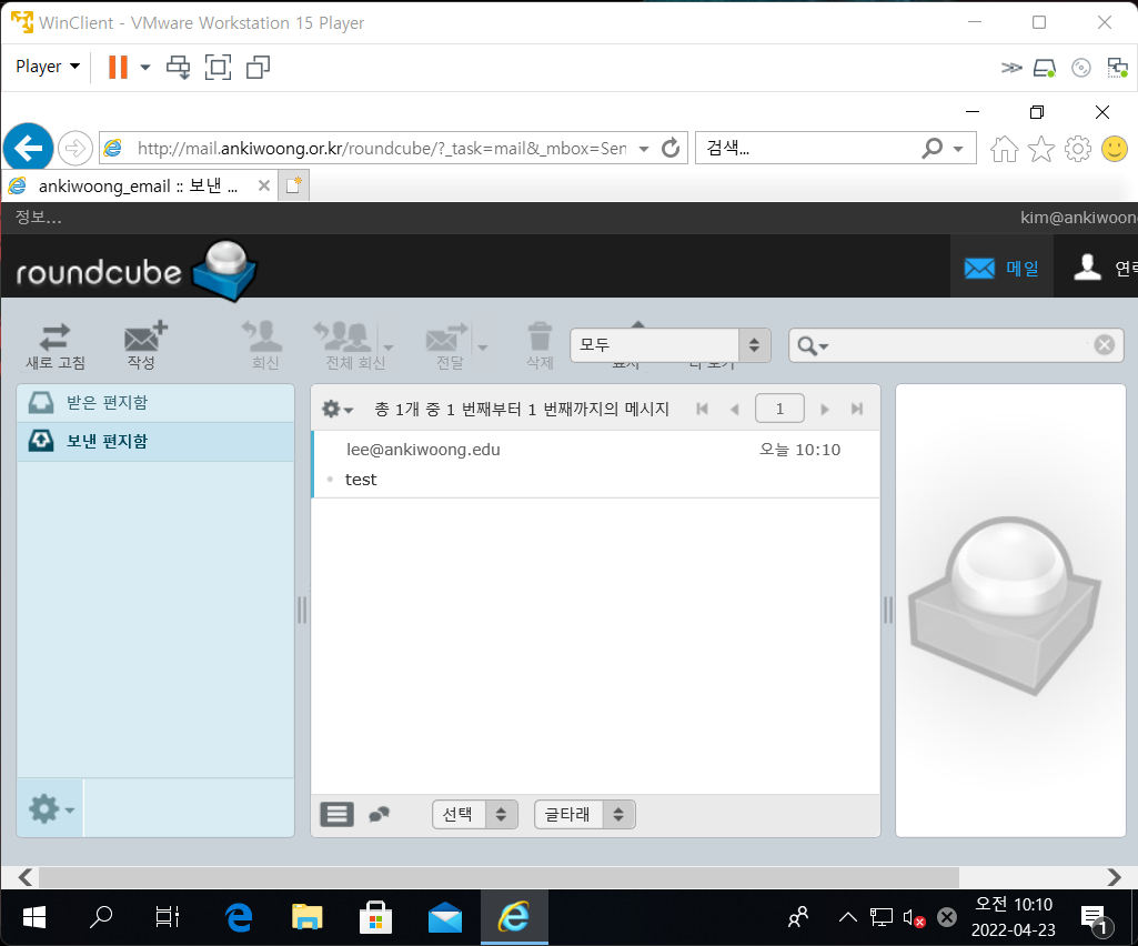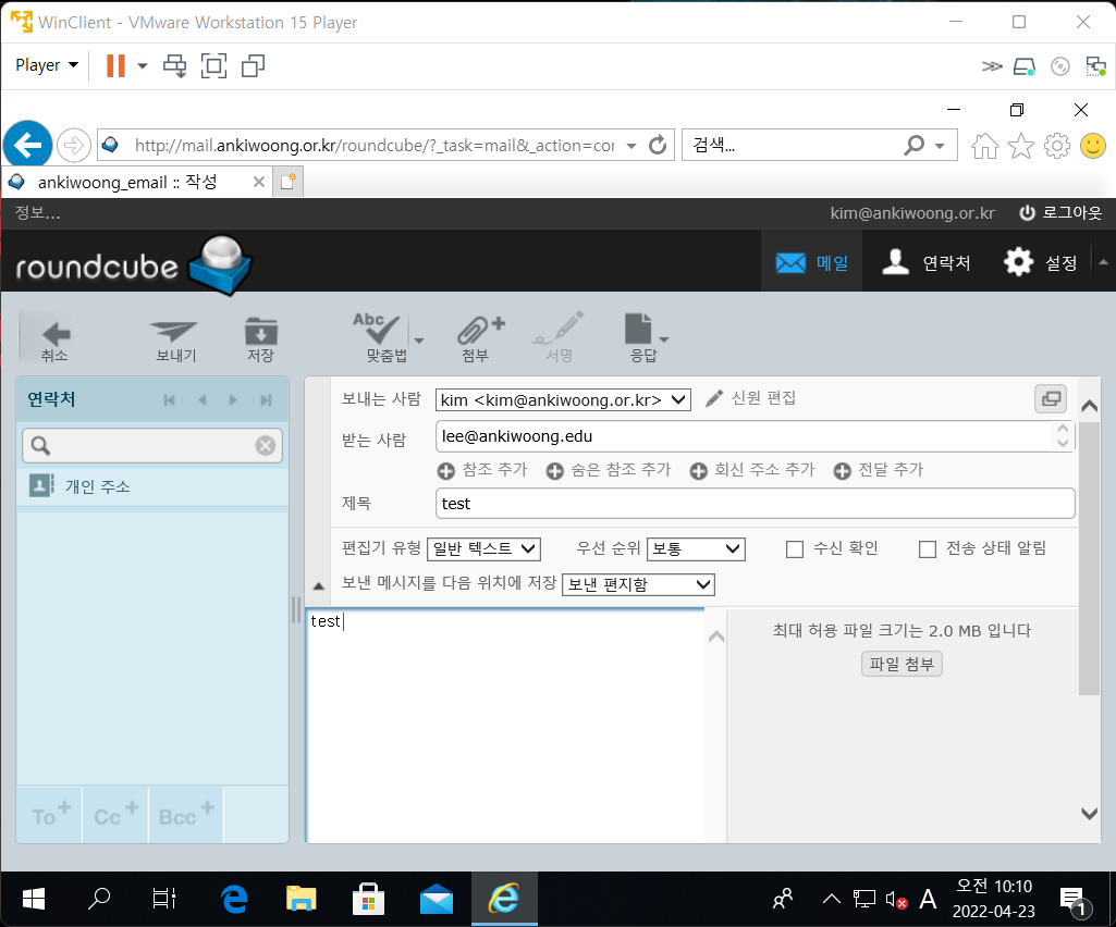 2. 메일 발신(발신 : kim@ankiwoong.or.kr/ 수신 : kim@ankiwoong.edu)