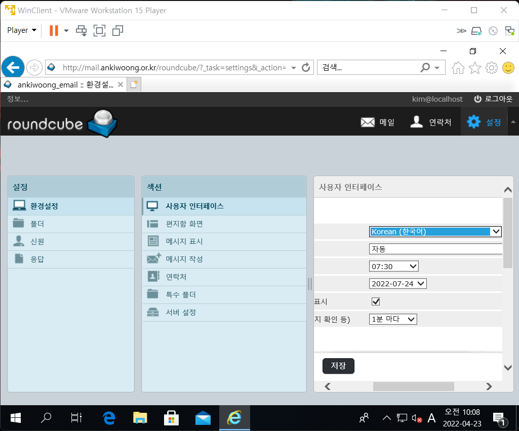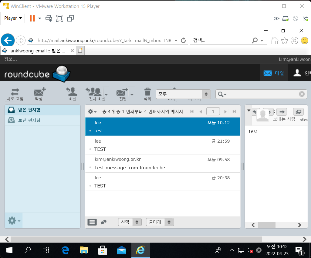 3. 메일 수신(발신 : lee@ankiwoong.edu / 수신 : kim@ankiwoong.or.kr)
