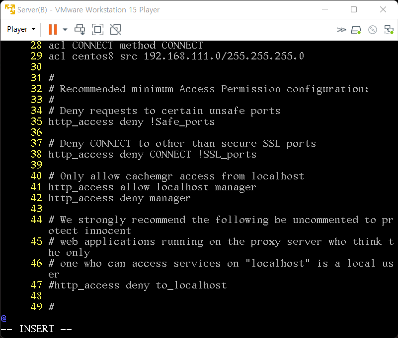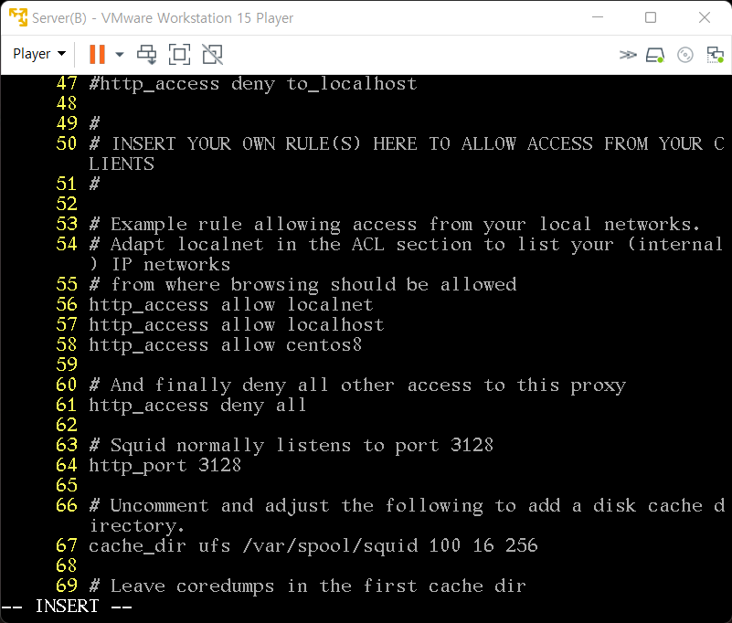 3. /etc/squid/squid.conf 수정(리눅스 프록시 프로그램 squid의 주요 설정 파일 / 서버 포트 설정, 접근 제어)