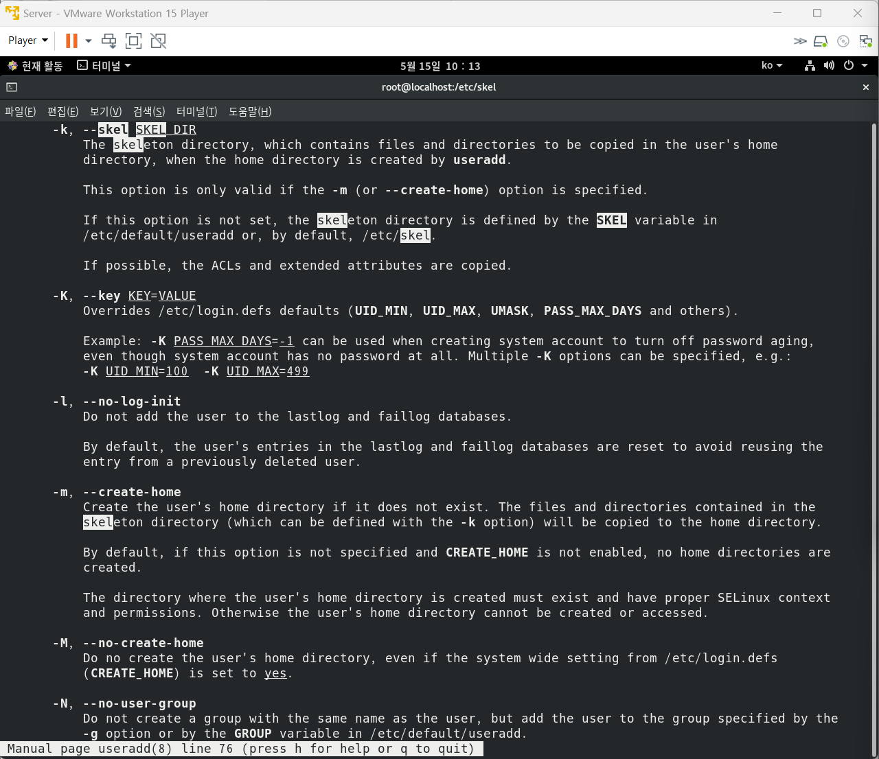 /etc/skel : 사용자 계정 추가 시 기본으로 제공하는 파일이나 디렉터리 위치