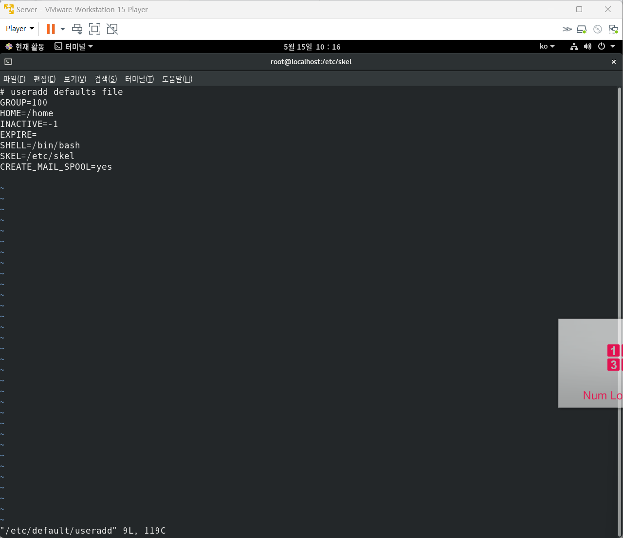 /etc/default/useradd : 사용자 계정을 생성할 때 default 값 정의