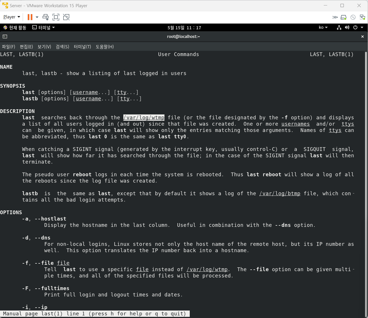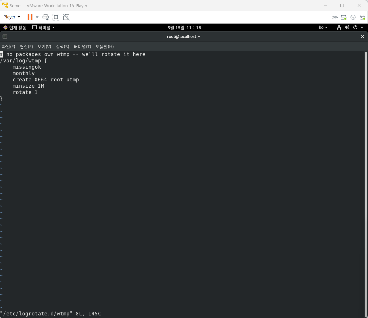 7. 다음은 last 명령으로 참조되는 로그 파일의 로테이션 관련 설정을 하는 과정이다.