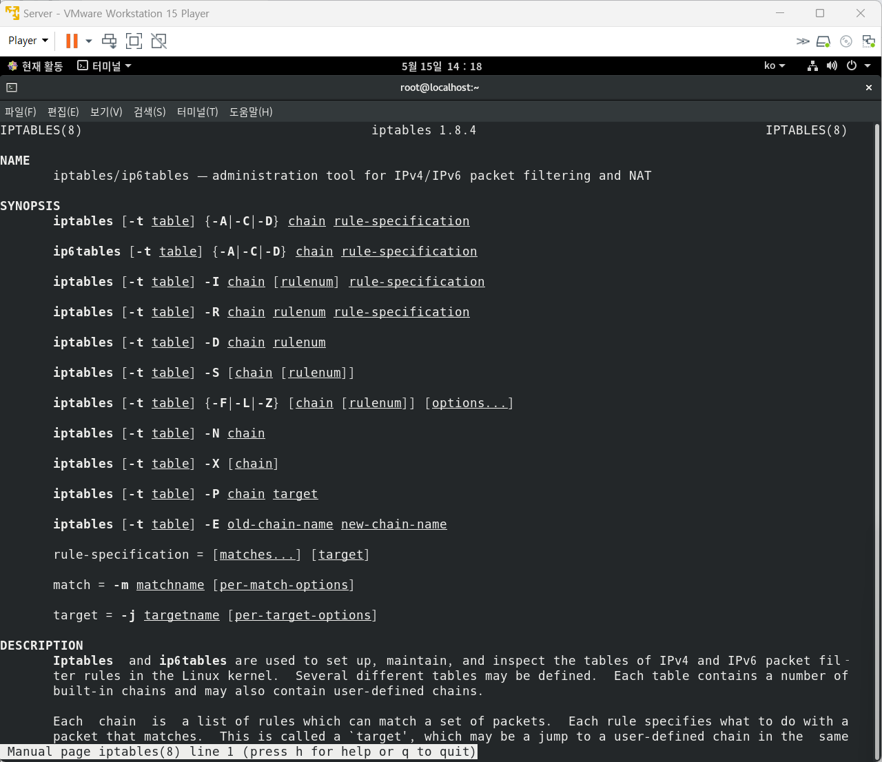 iptables : 패킷 필터링(Packet Filtering) 도구로서 방화벽 구성이나 NAT(Network Address Translation)에 사용