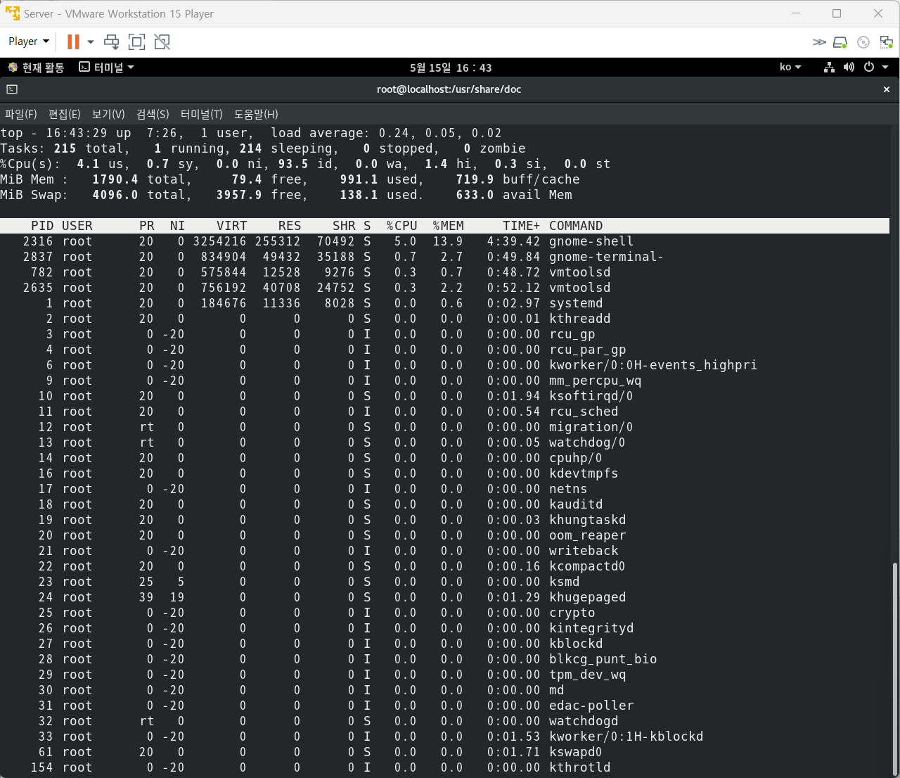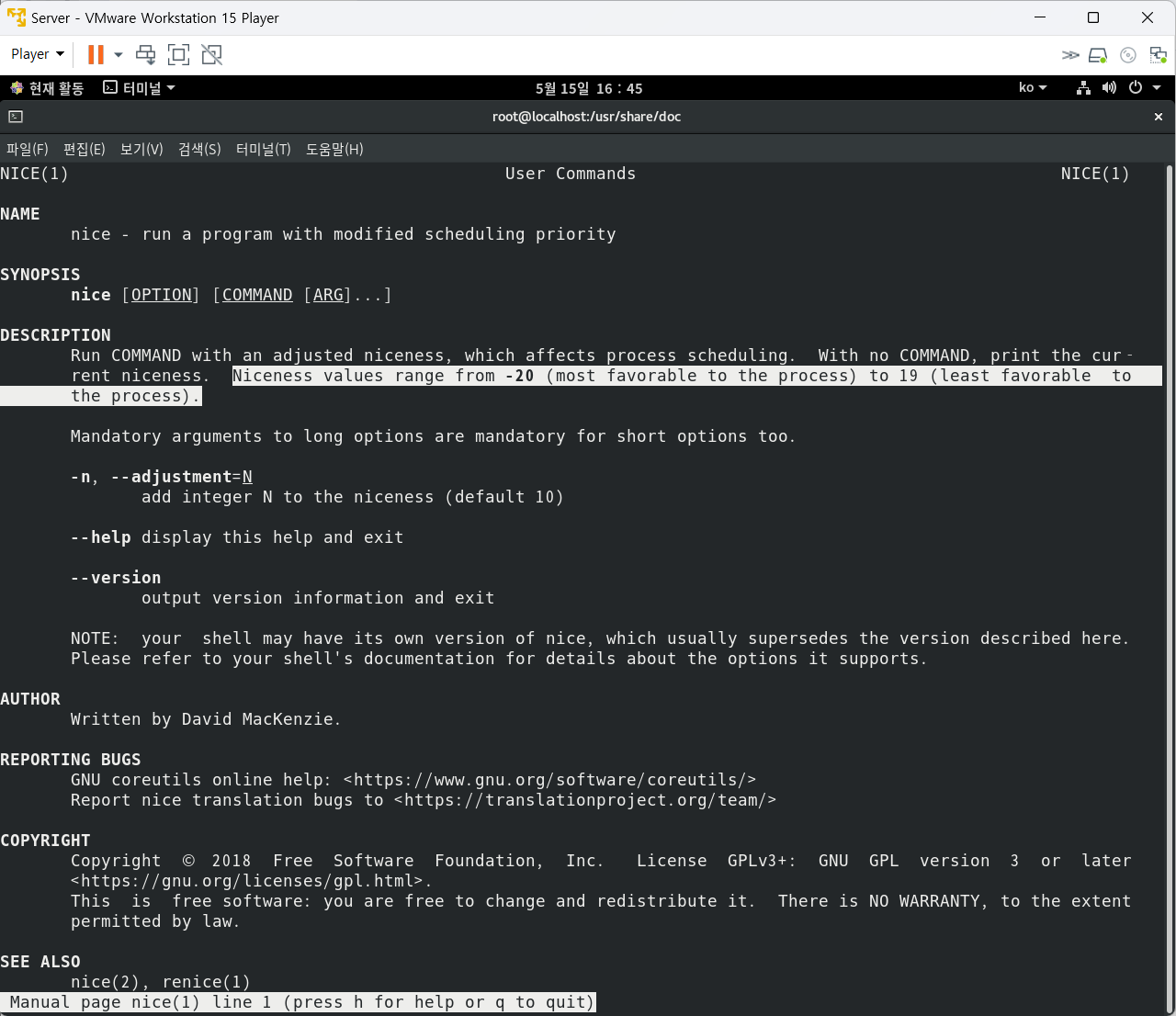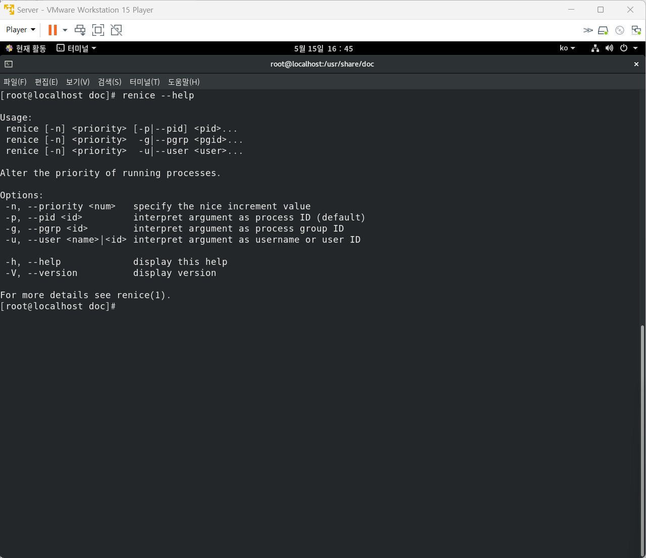 나. PID가 513인 프로세스의 NI값을 할당 가능한 최댓값으로 지정해서 우선순위를