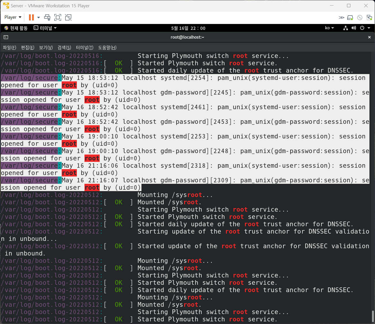 나. ssh와 같은 인증 관련 모든 기록은 root 사용자의 터미널로 전송한다.
