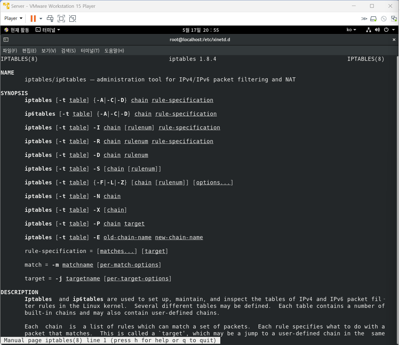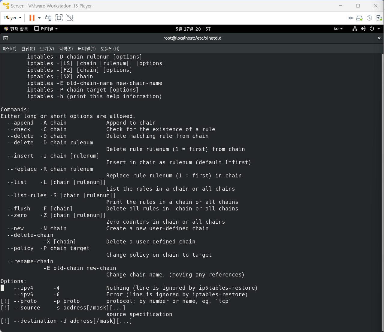 15. 다음은 iptables를 이용해서 방화벽을 설정하는 과정이다. 작업 사항에 맞게 ( 괄호 ) 안에 알맞은 내용을 적으시오.