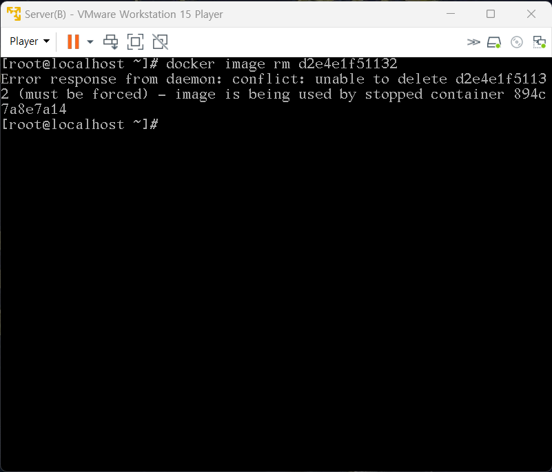 - 해당 이미지를 이용해서 생성된 컨테이너가 존재하므로 삭제할 수 없음
