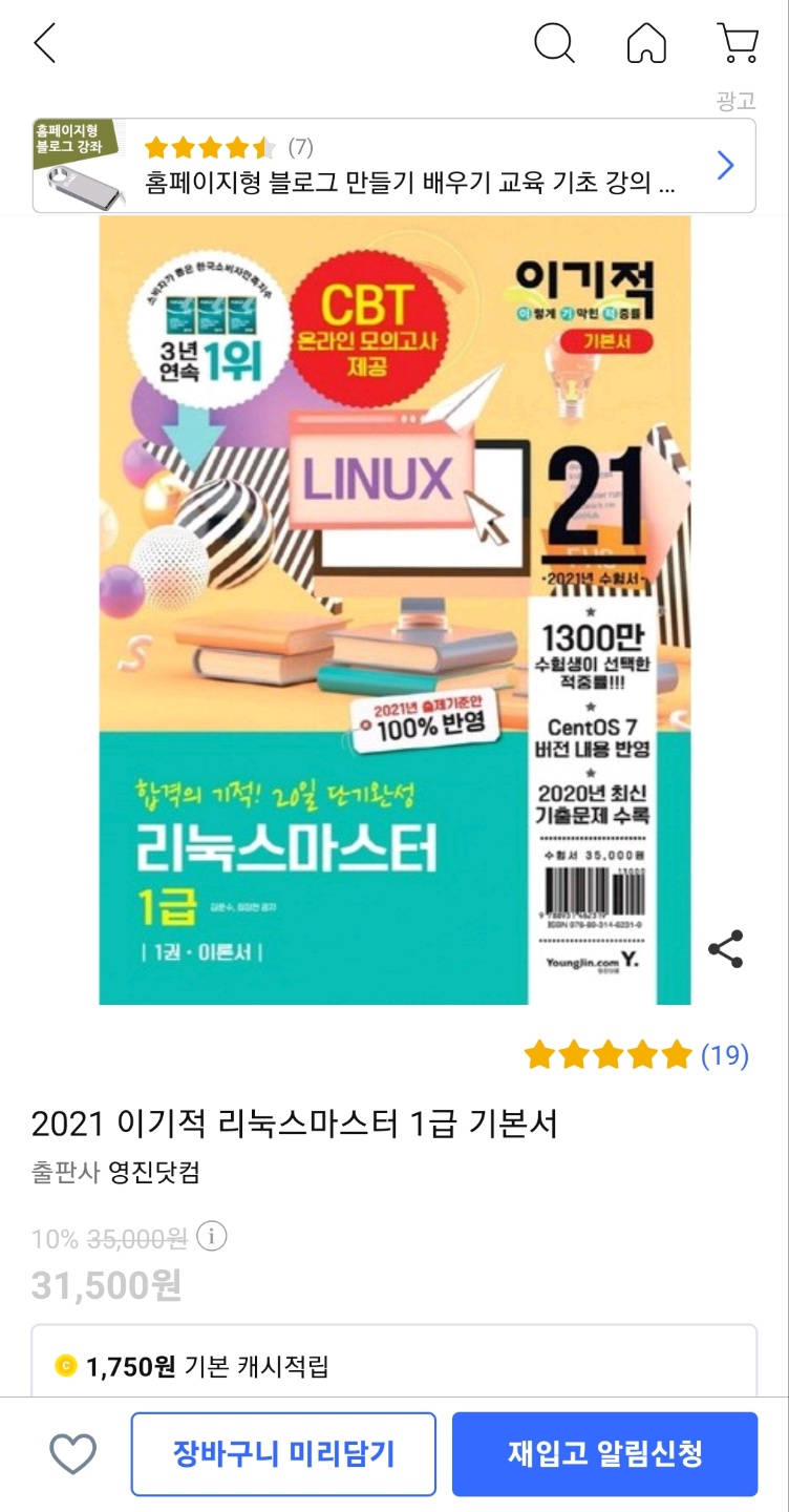 올해 목표였던 리눅스마스터 1급을 위해 기사 시험때도 기본서로 충족했던 이기적을 선택했다.