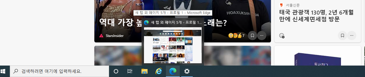 위에 설정을 하고 EDGE를 다시 실행 후 보면 아래와 같이 새 탭에 마우스를 올리면 아래와 같이 미리보기가 활성화 된다.