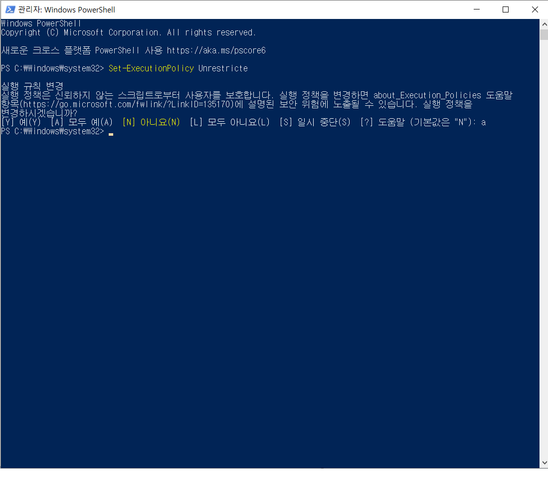 1. 시작 > Powershell > 관리자 권한으로 실행
