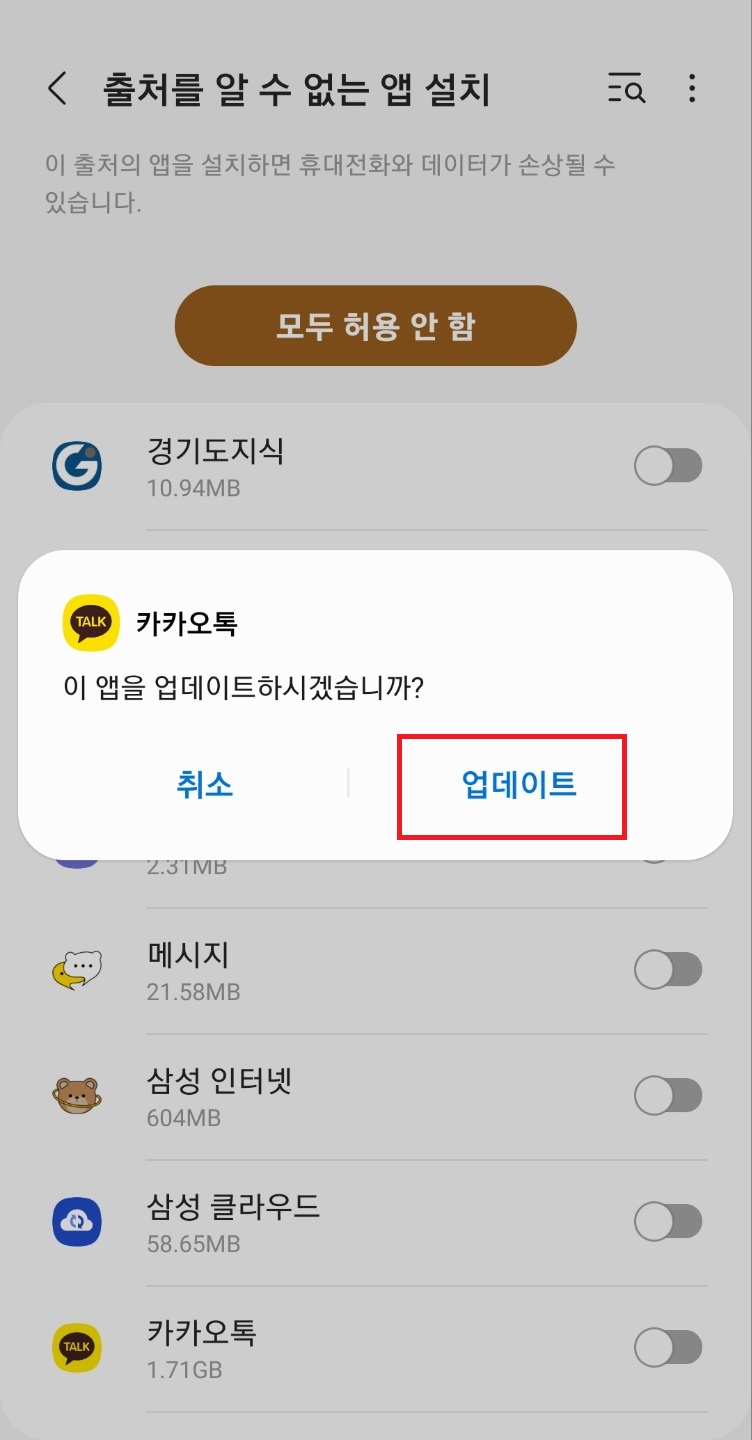 구글 플랫폼에서 카카오톡 업데이트를 막아 버렸다.