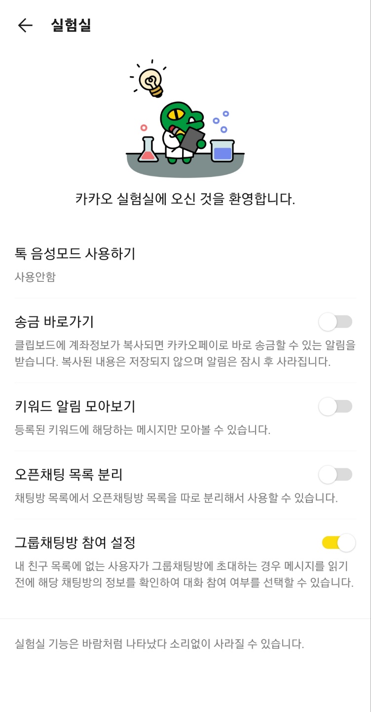 12. 설정 > 실험실 > 그룹채팅방 참여 설정