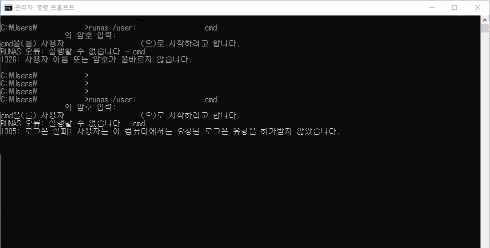 - 1385 : 로그온 실패: 사용자는 이 컴퓨터에서는 요청된 로그온 유형을 허가받지 않았습니다.
