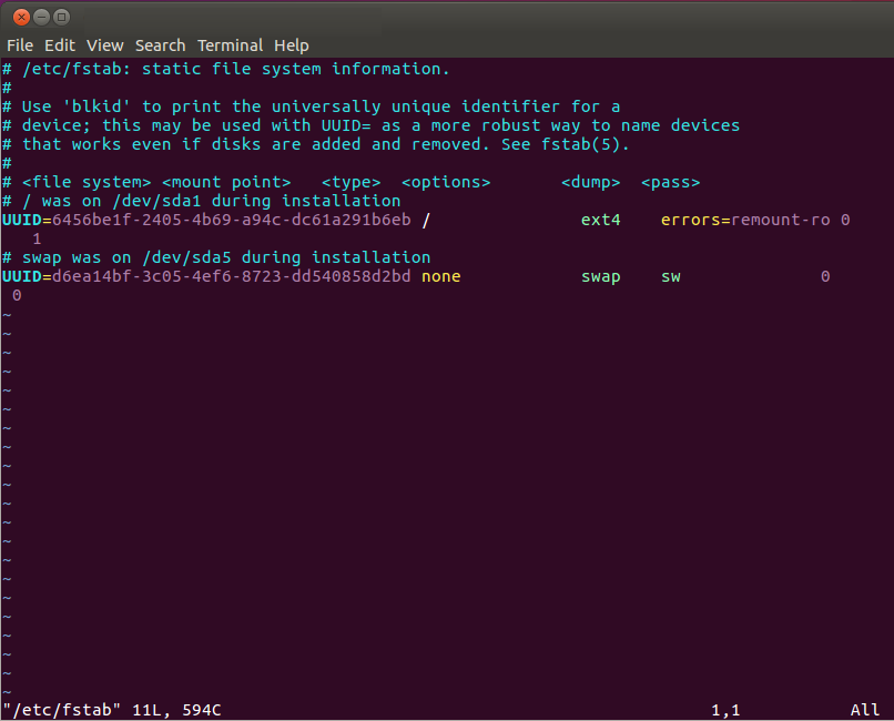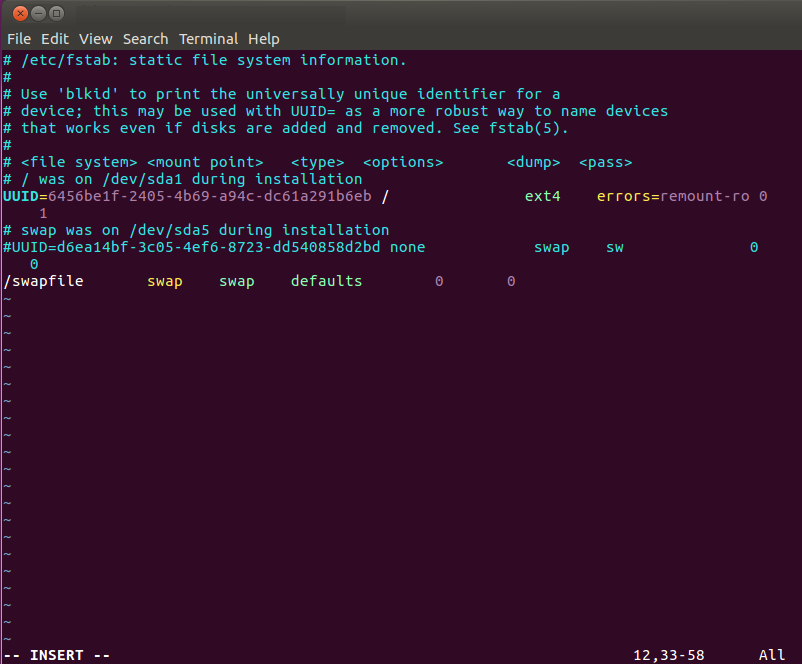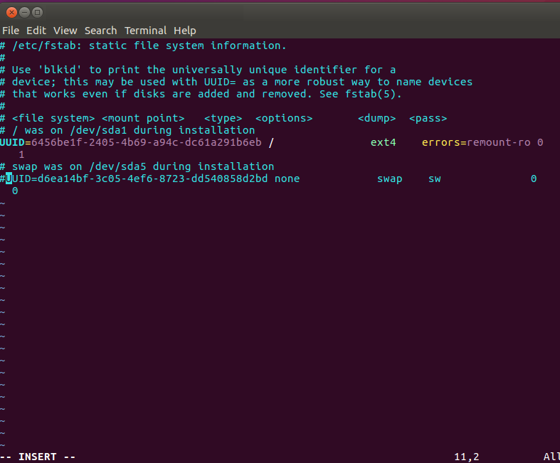 swap 파티션쪽을 제거 했으므로 맨 아래 swap UUID는 삭제하거나 주석 처리한다.