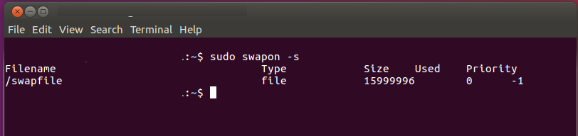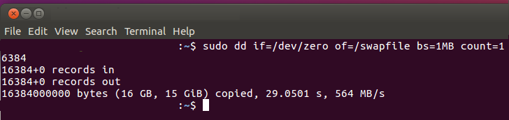$ sudo dd if=/dev/zero of=/swapfile bs=1M count=16384