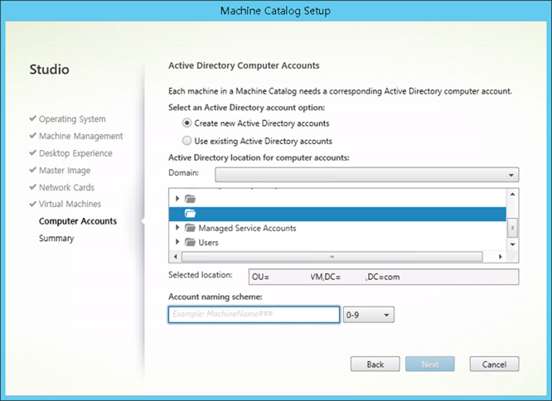 사용할 도메인을 선택하고, 생성할 OU를 선택한 다음 항목에서 생성되는 VM의 이름 형식을 지정