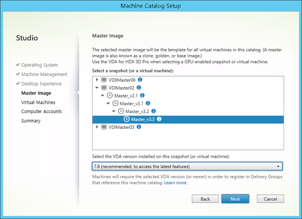 VDA(Virtual Delivery Agent) 설치 버전에 따른 스냅샷 종류를 선택하는 창